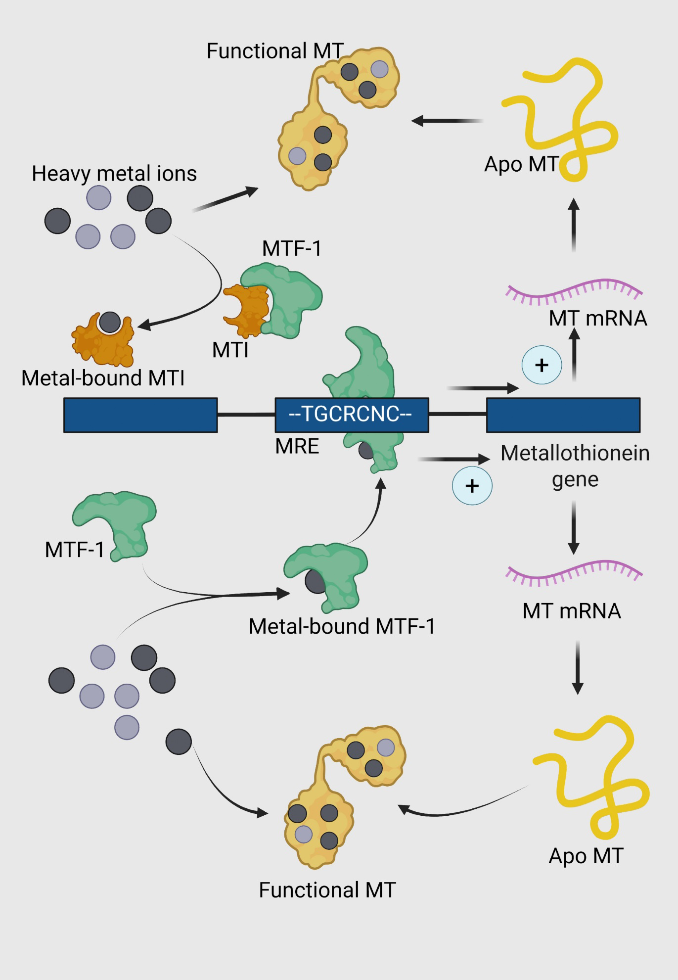 MTs are considered central in the intracellular regulation of metals such as Cu, Zn, Hg and Cd. Increased MT synthesis is associated with increased capacity for binding these metals and protection against metal toxicity (Bakiu et al., 2022). Though MT induction at the level of transcription is most extensively studied, the induction of MTs in response to heavy metals is known to occur at transcriptional, translational and post-translational levels. After entering the cytoplasm, the ion interacts with a complex of metal-regulatory transcription factor-1 (MTF-1) to bind to a regulatory sequence of DNA called metal-responsive element (MRE) (Günther et al., 2012). MREs contain a 7-bp core sequence (TGCRCNC) and are present in multiple copies in the promoter/enhancer regions of almost all metal-inducible MT genes (Searle, 1987). There are two possible models how the MTF-1 can bind to MREs in the genome (Figure 3). The first view is that MTF-1 acts as a metal sensor that cannot bind to DNA in the absence of metals (Günther et al., 2012). As cells accumulate metals, the metal binds to the α and β domains, causing a conformational change in the protein and subsequent binding to the MRE. When MT levels are insufficient, it chelates the metal from the domains forcing the MTF-1 to relinquish the MREs and thus ceasing the transcription. An alternative model proposes that the existence of a metal-sensitive inhibitor, generally known as the metal synthesis inhibitor (MTI) which complexes with MTF-1 rendering it inactive (Palmiter, 1994). As cellular metal levels increase, the metal binds to the MTI releasing it from MTF-1, allowing the transcription factor to bind to the MRE to activate transcription. When MT levels are sufficient, the metal is removed from the MTI, allowing it once again to bind to MTF-1, thereby inhibiting transcription (Morby et al., 1993).