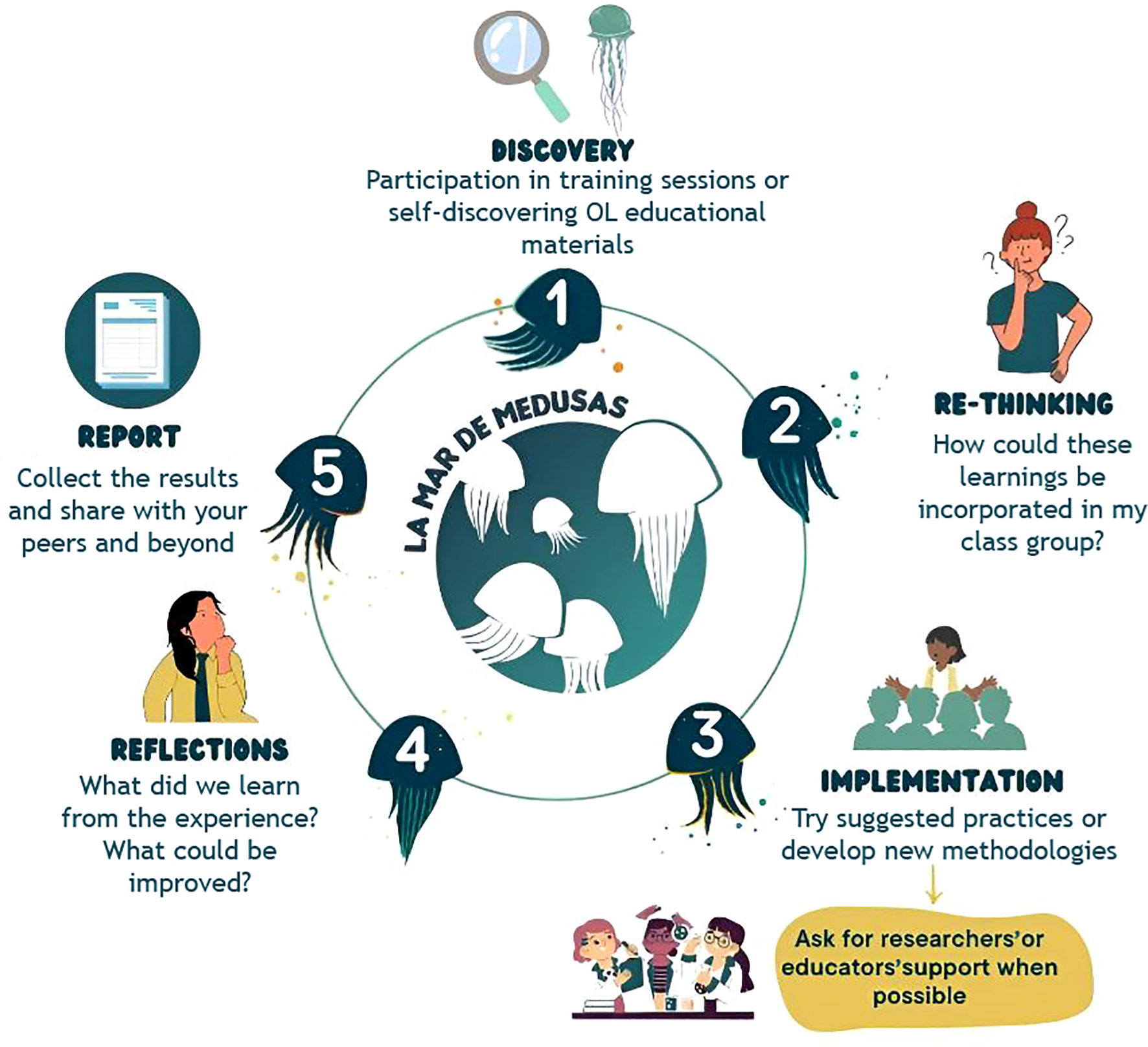 Process for optimizing the integration of OL concepts into schools, supported by marine researchers and educators (when possible), based on the experience of the La Mar de Medusas project.