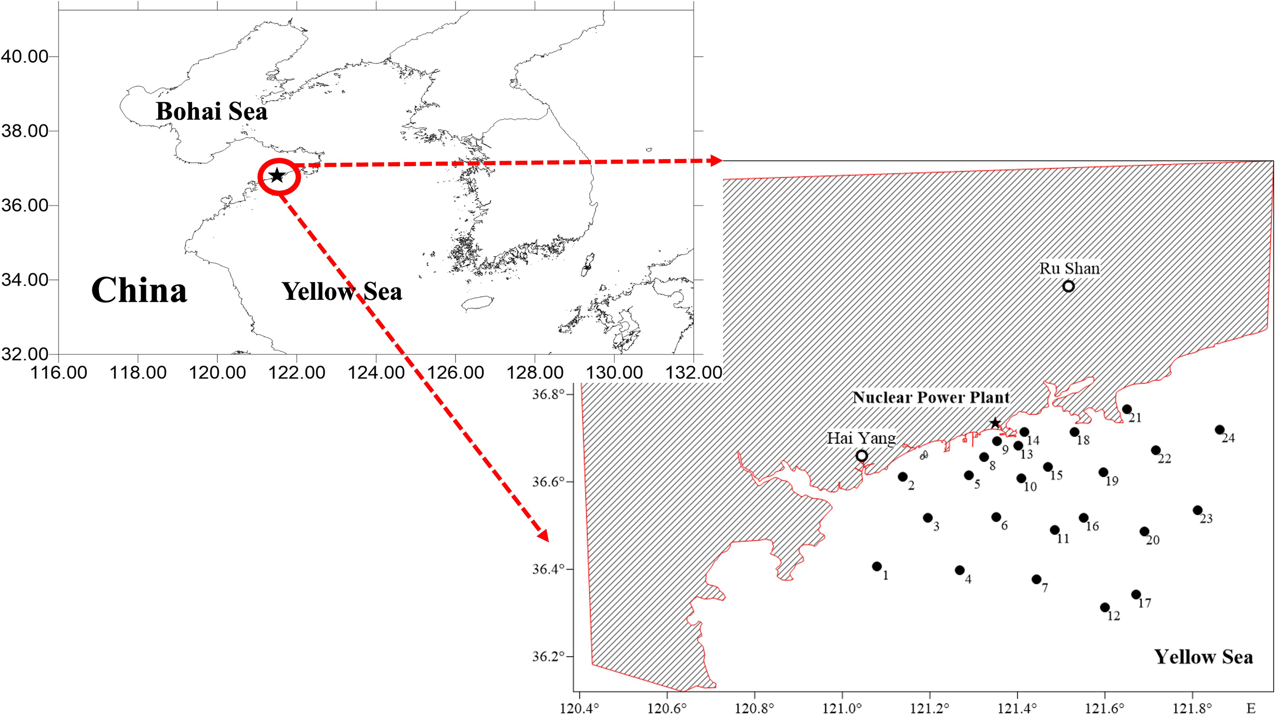 Study area and sampling stations (1–24) along the coastal Yellow Sea near the nuclear power plant.