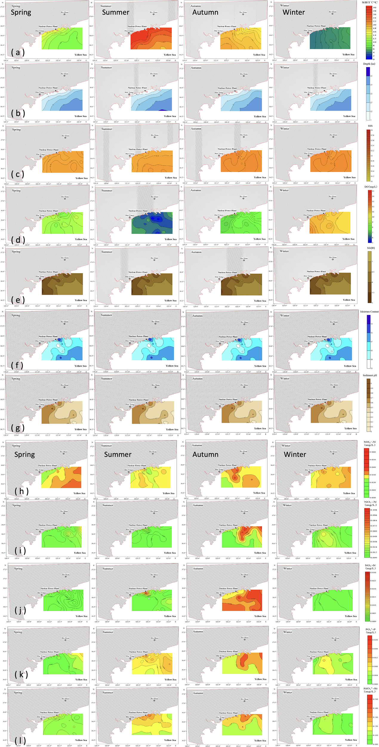The SBT and DO content exhibited significant spatiotemporal variability. SBT varied significantly between seasons and stations. The annual average SBT was 14.88 ± 8.17°C, with peak temperatures occurring in summer (up to 28.99°C) and minimum temperatures in winter, ranging from 3.64 °C to 5.11°C (Table 1). Elevated temperatures were noted in proximity to the coast, particularly adjacent to the HYNPP. In summer, SBTs were elevated in offshore regions, whereas in winter, the lowest temperatures exhibited a more uniform distribution. The yearly average DO concentration was 8.38 ± 1.83 mg/L, peaking in winter at 12.11 mg/L and declining in summer to a range of 5.06 mg/L to 7.15 mg/L (Table 1). Salinity displayed minimal seasonal fluctuation, sustaining a consistent annual average of 31.91 ± 0.18‰. Salinity levels exhibited a spatial gradient, progressively rising from southwest to northeast, with peak concentrations noted at the shorelines and around the HYNPP, especially during autumn and winter (Table 1; Figure 2). The sediment parameters displayed considerable stability over the year, with an annual average of Mz (6.26 ± 0.42 mm), Mc (43.73 ± 4.93%) and sediment pH (8.52 ± 0.11) and no significant spatiotemporal variation (Table 1; Figure 2). The distribution of the sea depth was rather consistent throughout the research area, varying from 7 to 32 m, with negligible seasonal or locational fluctuation.