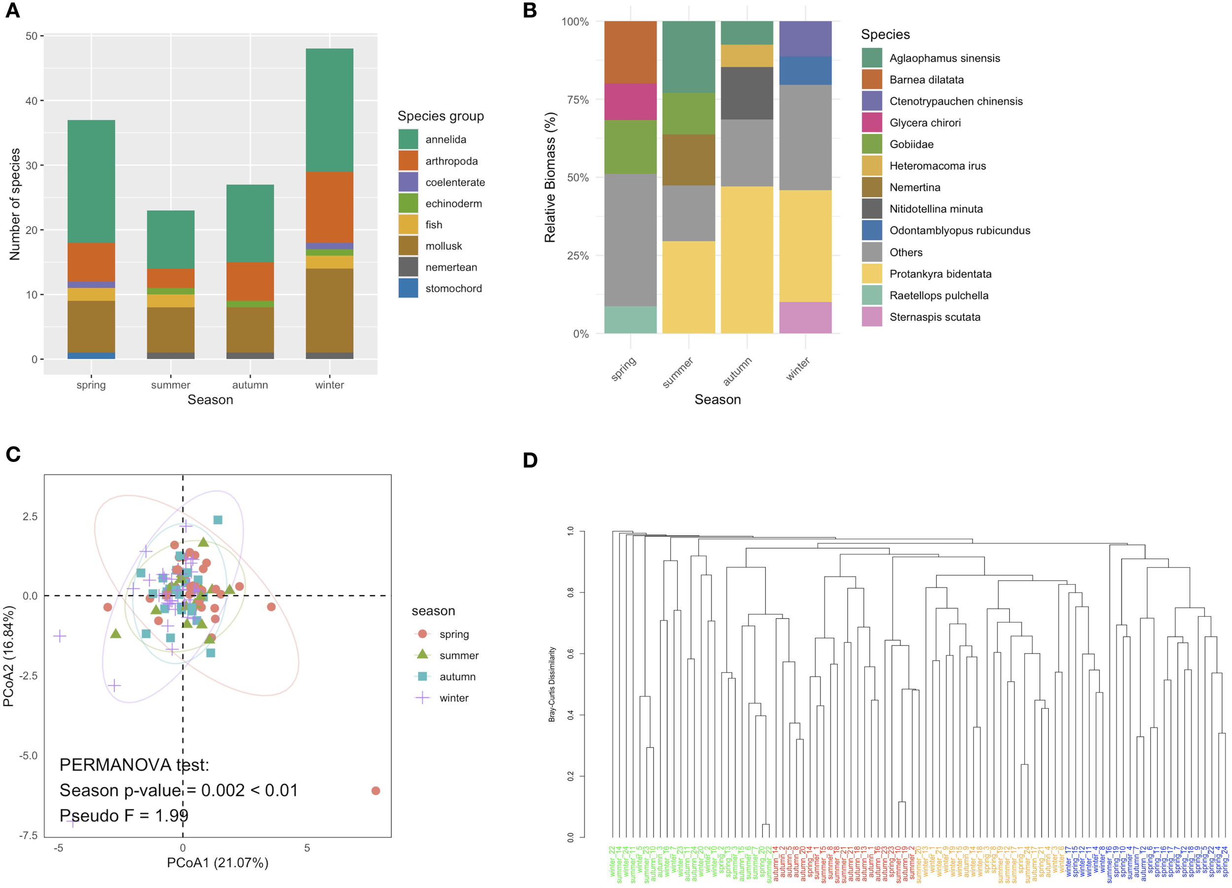 Seasonal variation in species composition in the study area. (A) Number of species within the macrobenthic communities in the four seasons; (B) relative biomass of major species within the macrobenthic communities in the four seasons; (C) principal coordinates analysis (PCoA) of significant differences in macrobenthic species composition across seasons; and (D) cluster analysis of macrobenthos biomass at each stations during the four seasons.