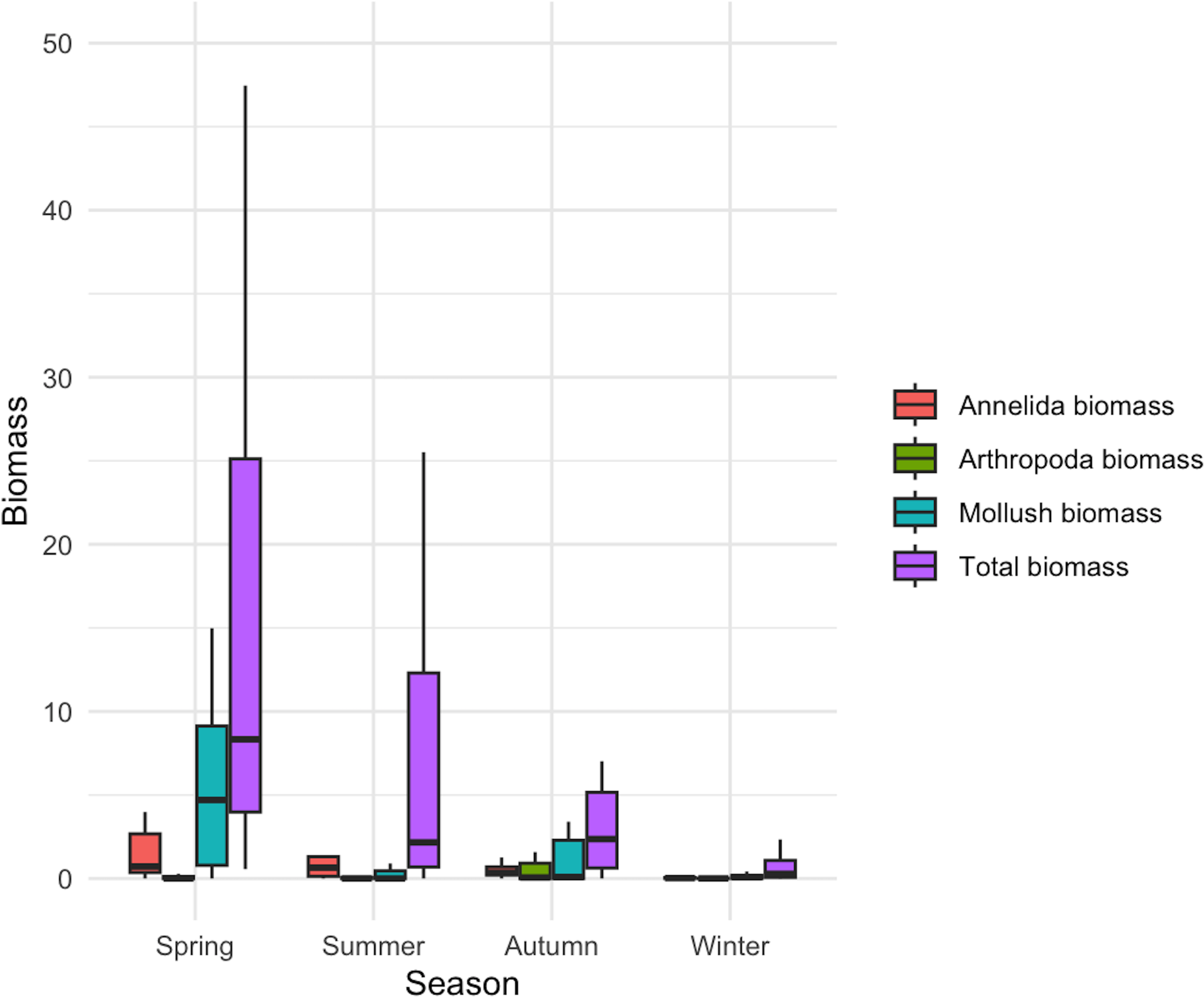 Seasonal distribution of biomass. The box plots illustrate the biomass distribution of three phyla, namely, Annelida (red), Arthropoda (green), and Mollusca (blue), and the total biomass (purple) across different seasons (spring, summer, autumn, and winter).