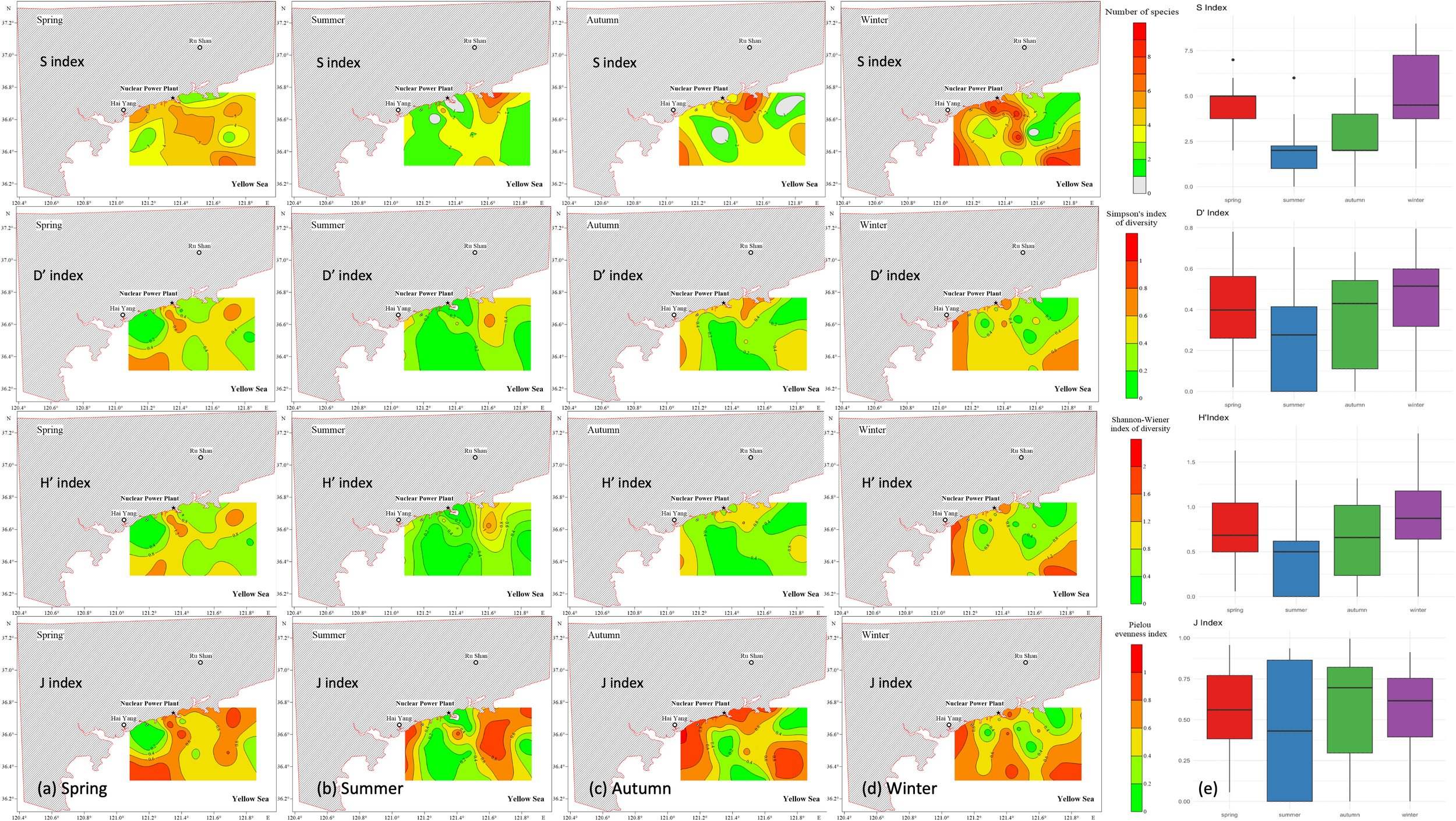 To visualize the spatial distribution of diversity indices, contour maps were generated based on data from 24 stations, and boxplots were used to illustrate their seasonal variation. This study then investigated the influence of environmental factors, including temperature, salinity, DO, water depth, sediment parameters (moisture content, Mz, and pH), the contents of nutrient salts, and the phytoplankton cell count, on these indices. Spearman correlation analysis was conducted using “cor()” to compute correlation coefficients, and “cor.test()” was applied to assess significance. The correlation matrix was visualized using “qcorrplot()” (linkET package). To address the issue of multiple comparisons, Bonferroni correction was applied by adjusting the significance threshold according to , where is significant level and represents the total number of pairwise tests (with 17 variables in total). Then we had a corrected significant threshold of , which was used to evaluate the significance of the correlation results in spearman. In order to further explore the relationship between environmental variables and diversity indices, all four seasonal surveys were pooled and a RF regression (randomForest package) was fitted with 13 hydro-environmental factors, providing a year-round, integrated depiction of how environmental factors responds to the macrobenthic species diversity near the HYNPP. This model was used to assess the impact of these factors on species diversity indices, with model performance evaluated based on the percentage of explained variance, where higher values indicated a better fit. The RF algorithm offers significant advantages in handling high-dimensional data, bypassing the need for multicollinearity testing and variable screening required in traditional nonlinear regression methods. RF models outperform GAMs in predictive accuracy for macrobenthic assessments, particularly when dealing with complex ecological datasets characterized by strong multicollinearity, high frequencies of zeros, and overfitting. Studies by Kosicki (2020) and Colombelli et al. (2022) show that the RF approach reduces prediction error, especially in scenarios with numerous significant predictors. RF’s ability to rank predictor importance helps identify key environmental factors affecting macrobenthic diversity, making the RF method invaluable for studying ecosystems in dynamic, anthropogenically impacted environments, such as those near nuclear power plants. Given RF’s ability to handle multicollinearity, traditional stepwise regression was not employed in the current study. The importance of each factor was determined using the mean decrease accuracy metric extracted via “importance()”. Partial effect plots were generated by predicting responses with “predict()” and visualized using “ggplot()” (ggplot2 package), employing “geom_smooth()” for continuous variables. All mean values are presented in this manuscript as the mean ± standard deviation (± SD), with data ranges displayed in tables. The top five most important factors for diversity indices were selected for further analysis.