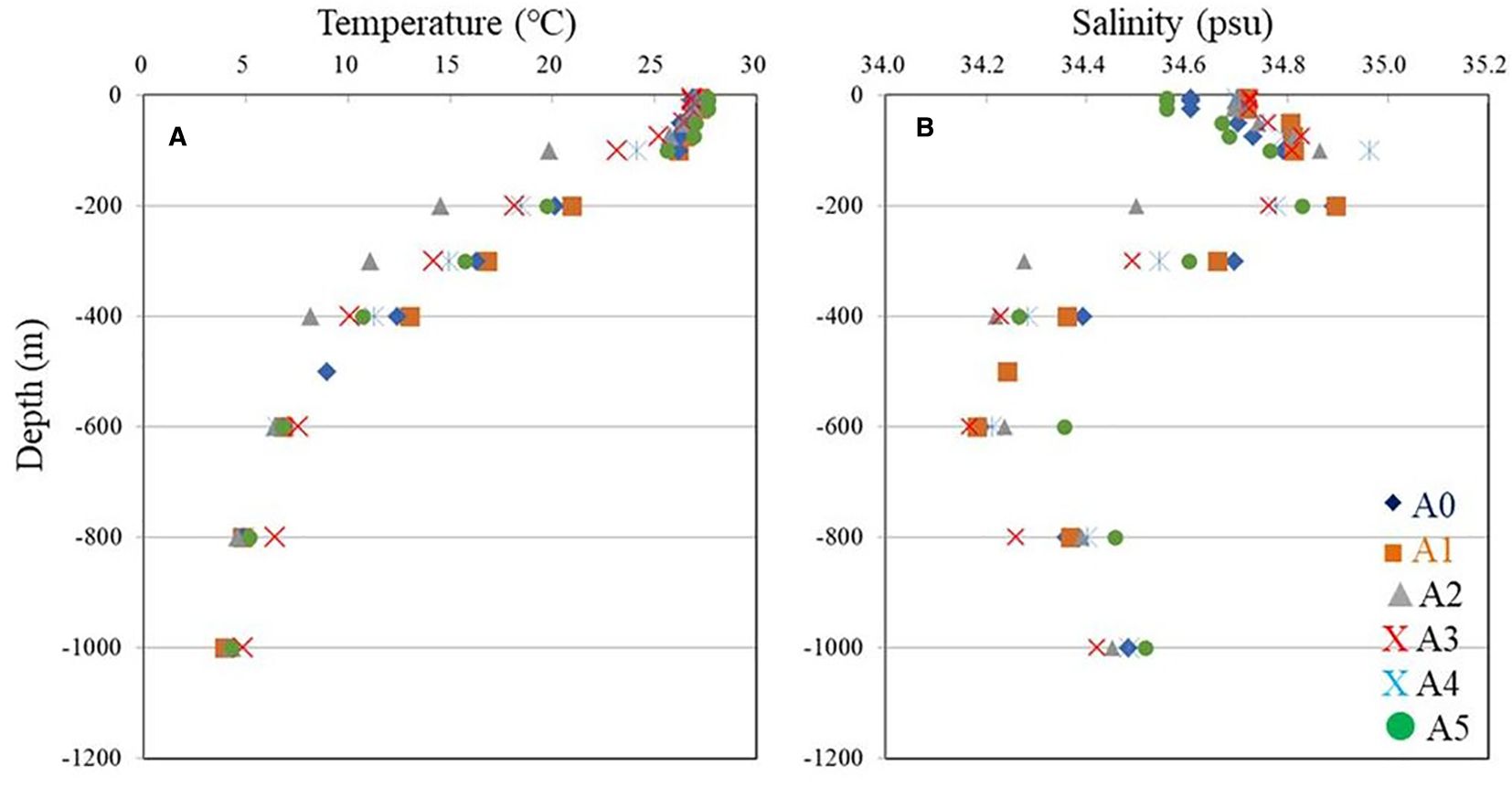 As presented in Figure 2, there was a clear difference in hydrography across the cold eddy. Both isothermal and isopycnal gradients are clearly raised in the center of the cold eddy to the surface water, which may cause a difference in salinity and temperature between the center and the surrounding water (Figures 2A, B). Based on the vertical distribution of temperature and salinity along the transect, a dome structure was observed at the center of the eddy (Figure 2). At station A3, the temperature ranged from 18.1°C to 26.9°C, and salinity was between 34.73 and 34.83 psu in the upper 200-m depth (Figures 2A, B). Comparing the vertical profiles of environmental parameters at the six stations, the shallow waters of the cold eddy (station A3) displayed lower temperatures and higher salinities (Figure 2).