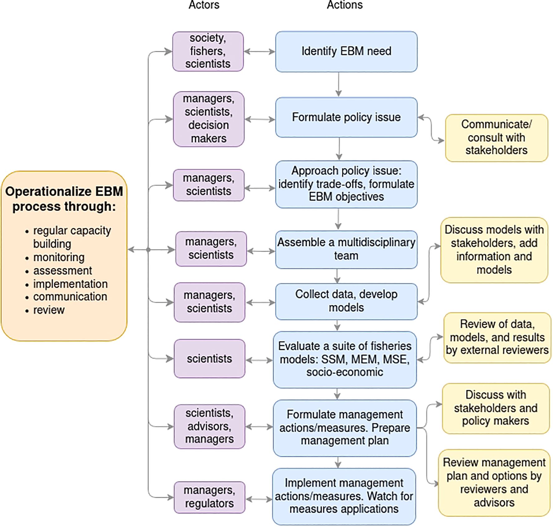 Once the EBM process is operational, its components and subprocesses need constant iterative adaptive updating. Data collection, knowledge base, and models need to be improved and tailored through periodic workshops by interdisciplinary teams of scientists and managers. Models, recommendations, and advice need to be re-evaluated through a series of reviews at different levels (experts and stakeholders). Communication between modelers, managers, and stakeholders is essential, and would enable model and procedure refinement, and ensure their usefulness. Communication with stakeholders would enable scientists to respond to urgent and critical events by providing strategic and tactical advice for holistic planning and operational applications (Townsend et al., 2019).