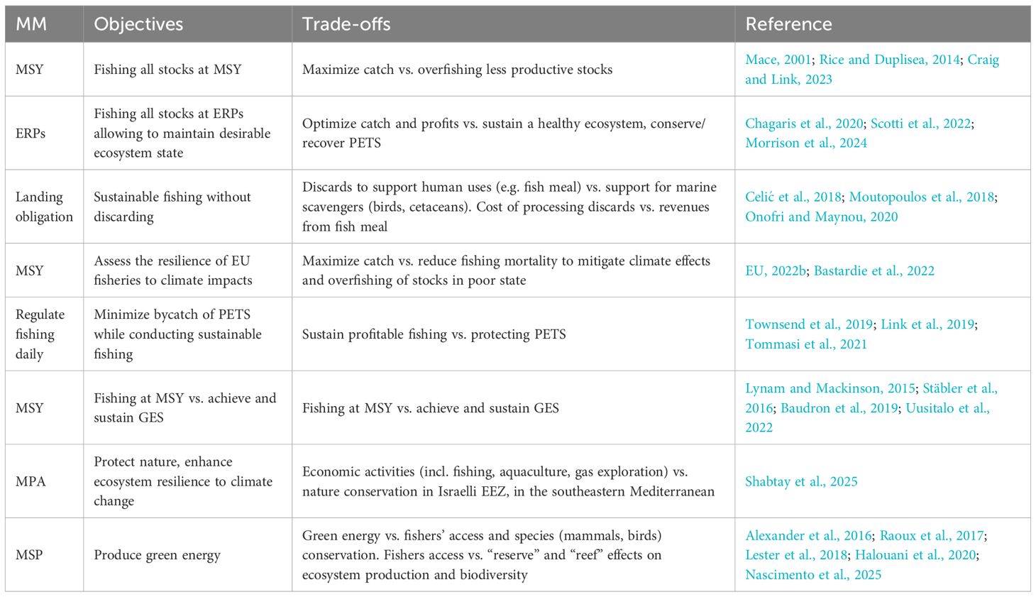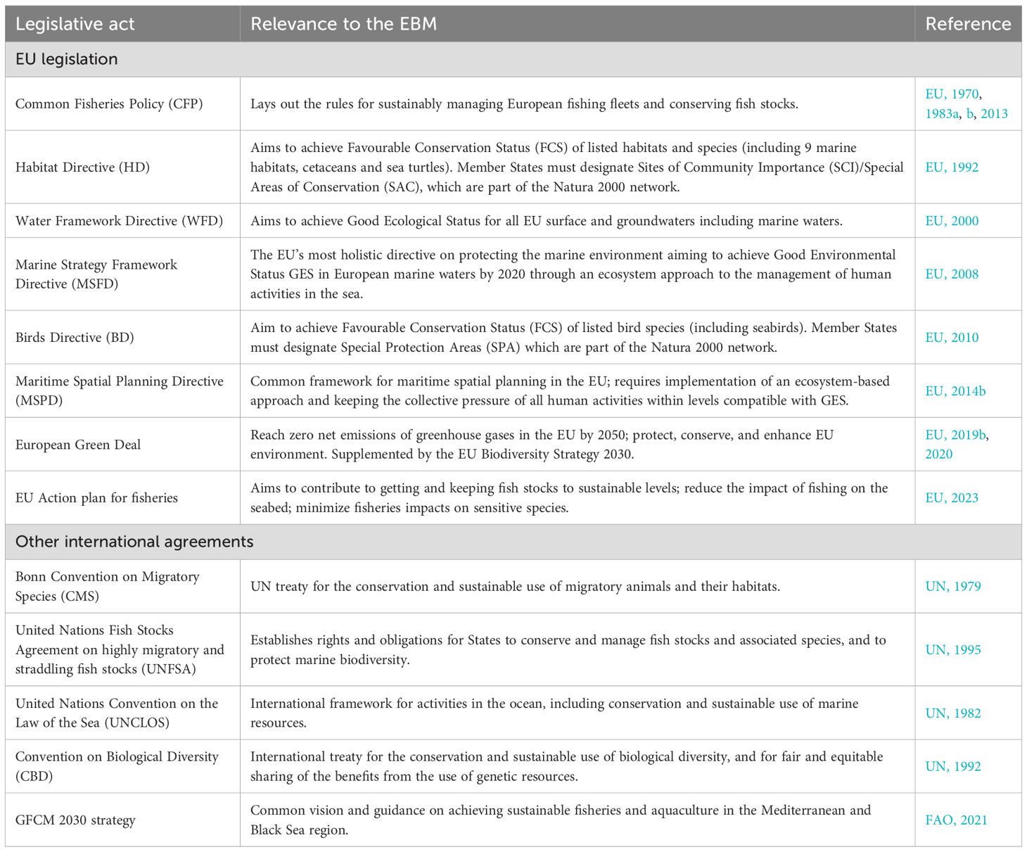 Table 3. International legislation addressing EBM needs, objectives, tools, and management measures to achieve them (modified from Rodriguez-Perez et al., 2023).