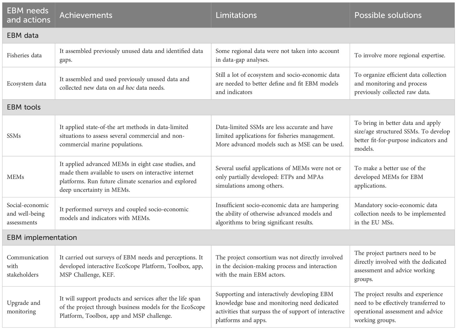The main objective of the EcoScope project is to help develop an efficient ecosystem-centered approach to fisheries management by providing the necessary data, tools, and communication media directly to users. With respect to this, the building of the EcoScope applications such as MEMs developed for the different sea basins and their availability for testing and use by stakeholders in the EcoScope platform, toolbox, and app were the project’s most essential outputs. This said, we can ask ourselves whether the achievements of the project are sufficient to help the implementation of EBM in Europe, and what problems and limitations we have encountered, that should be avoided in similar future efforts (Table 5).