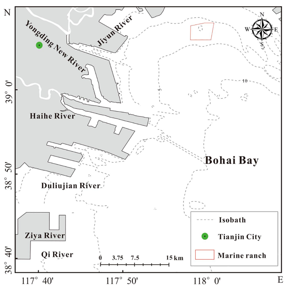 Schematic diagram of the national-level marine pasture demonstration area in the Dashentang Marine Ranch in Tianjin Bohai Bay, China.