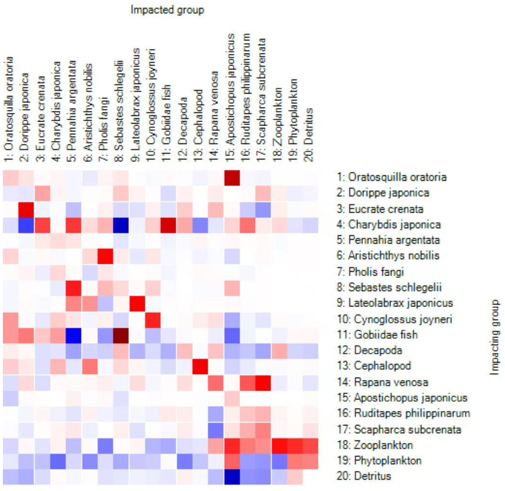 Based on the ecological characteristics, economic importance, and species’ functional roles in the Dashentang Marine Ranch, 20 functional groups were defined, as listed in Table 2. These include:Oratosquilla oratoria, Dorippe japonica, Eucrate crenata, Charybdis japonica, Pennahia argentata, Aristichthys nobilis, Pholis fangi, Sebastes schlegelii, Lateolabrax japonicus, Cynoglossus joyneri, Gobiidae fish, Decapoda, Cephalopod, Rapana venosa, Apostichopus japonicus, Ruditapes philippinarum, Scapharca, Zooplankton, Phytoplankton and Detritus.