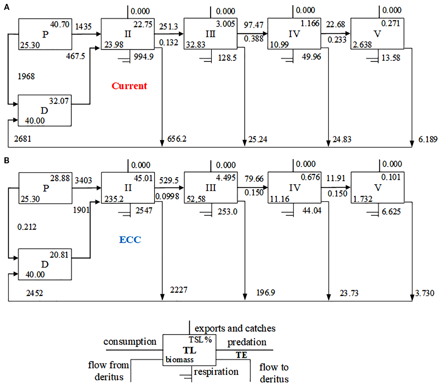 The ratios TPP/TR and TPP/TB are key indicators of ecosystem stability and maturity, reflecting energy utilization efficiency and the relationship between biomass accumulation and primary production, respectively (Ulanowicz, 1986). Additional indices, including the Finn Cycling Index (FCI), Connectance Index (CI), System Omnivory Index (SOI), and Finn Mean Path Length (FMPL), provide insights into the complexity of energy cycling and food web topology (Finn, 1976). Trophic Transfer Efficiency (TE) is a key metric that quantifies the proportion of energy transferred between successive trophic levels, providing insights into the efficiency and structure of energy flow within the ecosystem (Dunne et al., 2002). The Shannon Diversity Index (SDI) is also widely used to assess biodiversity, contributing to evaluations of ecosystem stability (Magurran, 2004).