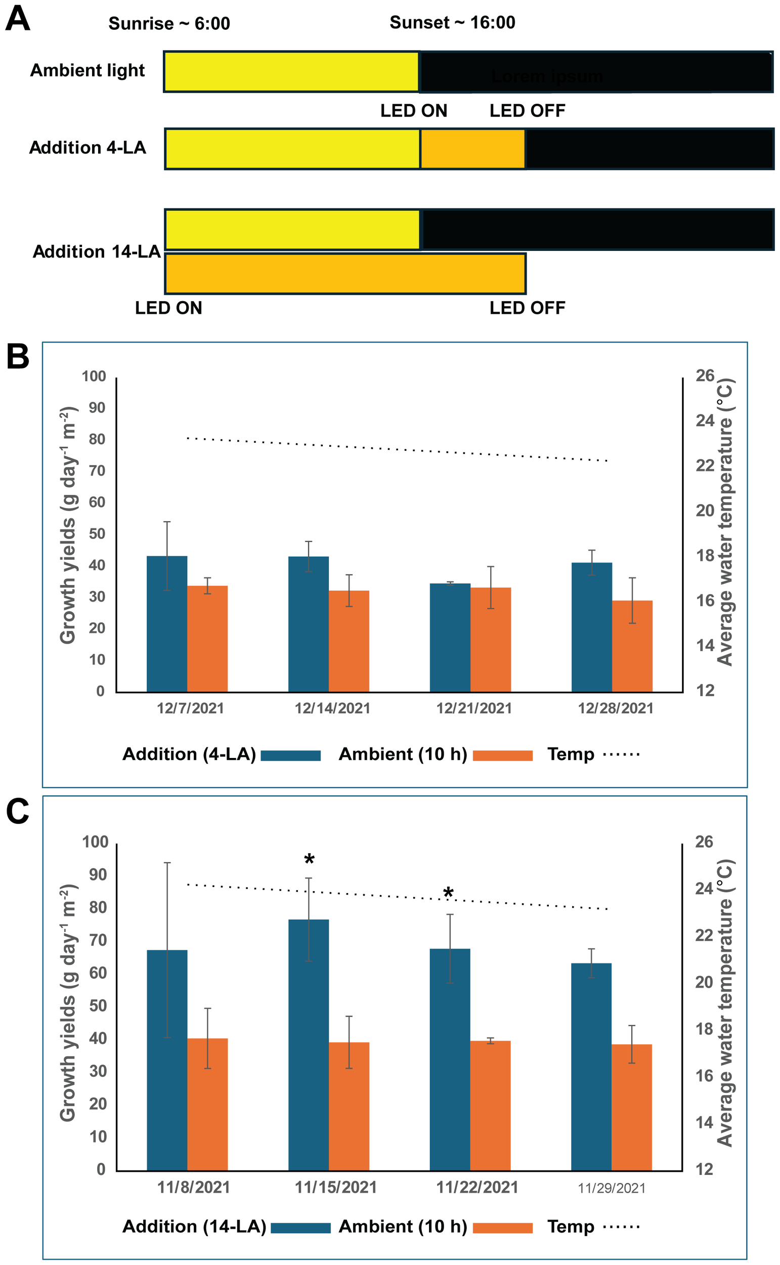 Light addition experiments. (A) light addition scheme of a 24-hour period. Yellow bars represent natural sunlight, orange bars represent artificial LED illumination, Black bars represent darkness. The points where the LEDs were turned on and off are indicated. (B) Growth yields of G. cornea with 4 hours light addition compared to ambient conditions. Water temperature is also indicated, (C) 14 hours l light addition compared to ambient conditions. Water temperature is also indicated. * marks a statistically significant (p < 0.05) difference between light addition and ambient. Error bars represent standard deviation with n=3.
