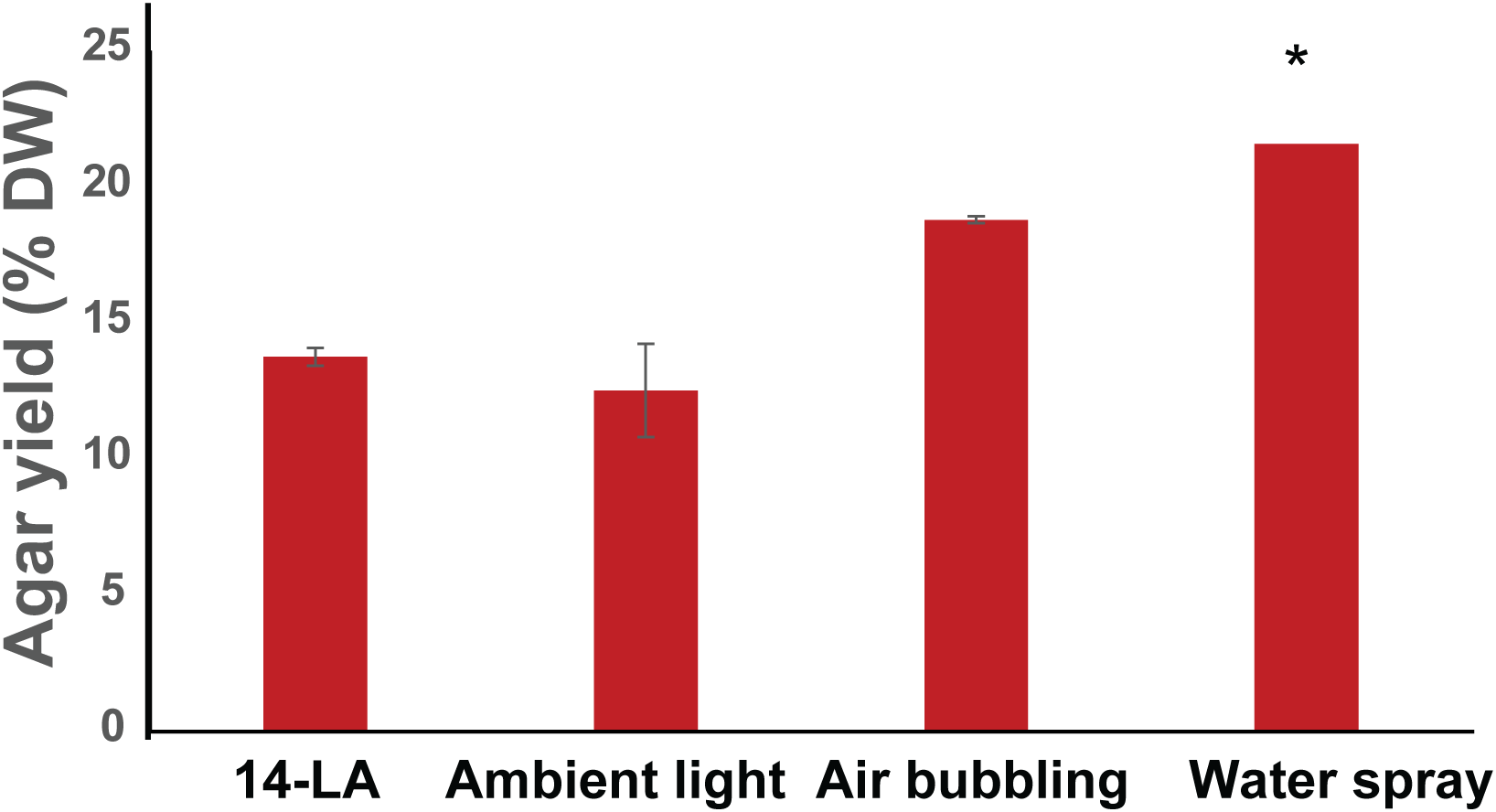 There was no significant difference in the agar yields of G. cornea between the LA-14 and ambient conditions (Figure 3) on a seaweed weight basis. Nonetheless, the total agar produced per square meter is expected to be higher in the LA-14 conditions, due to the higher total biomass accumulation (Figure 1C). Interestingly, seaweeds that were grown with water mixing through the water spray method had higher agar yields than those with the traditional air bubbling setup (Figure 3).