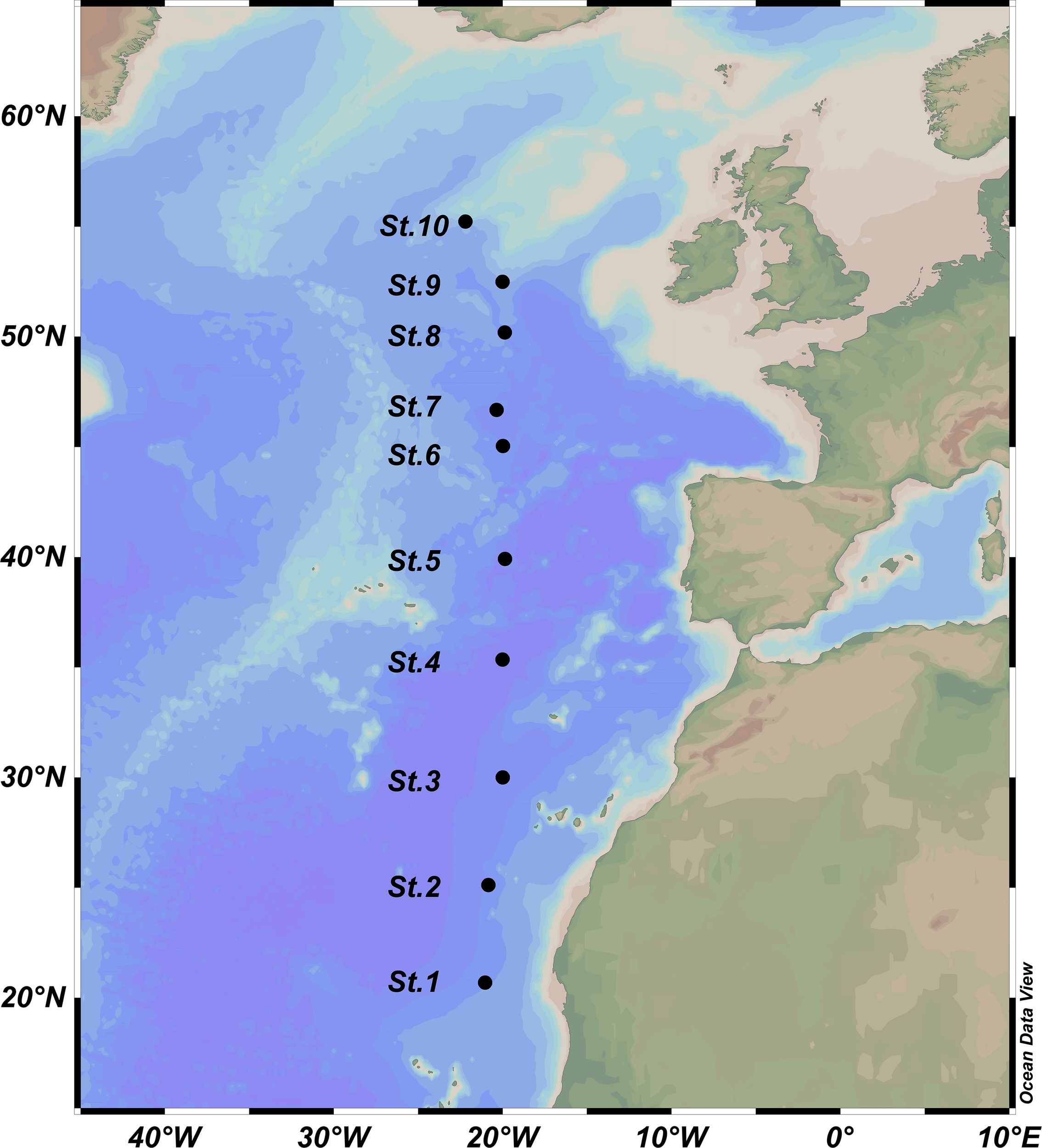 Map of the area and location of the 10 sampled stations along the 22°W transect in the North Atlantic Ocean.