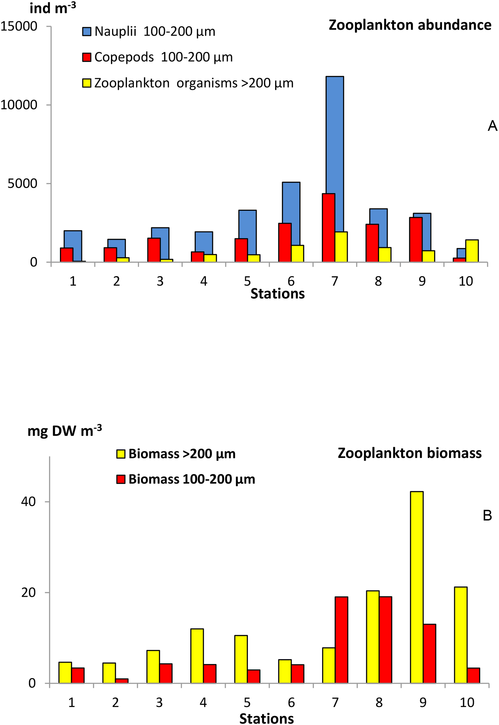 Zooplankton abundance and biomass in the epipelagic layer (0–200 m) across the studied transect. (A) Abundance (ind·m-3) of nauplii, small copepods (100-200 µm), and total zooplankton organisms (>200 µm), and (B) Biomass (mg Dry Weight·m-3) of the micro- (100-200 µm) and mesozooplankton (>200 µm) collected in the epipelagic layer (0–200 m).
