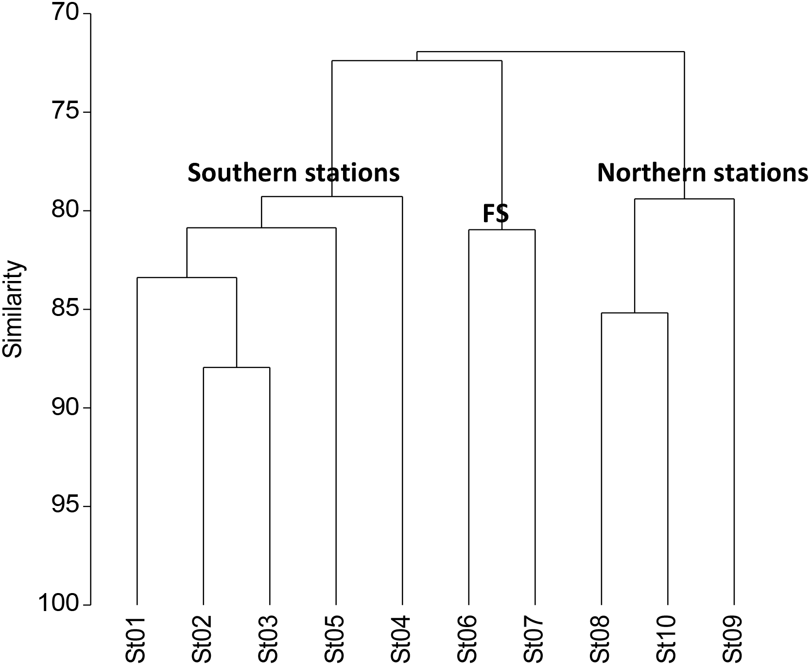 Hierarchical clustering of the sampled stations considering the abundance of the dominant taxa in the epipelagic layer (0–200 m) after fourth root transformation and a resemblance of Bray-Curtis similarity, segregating the north from the south by the frontal stations (FS).