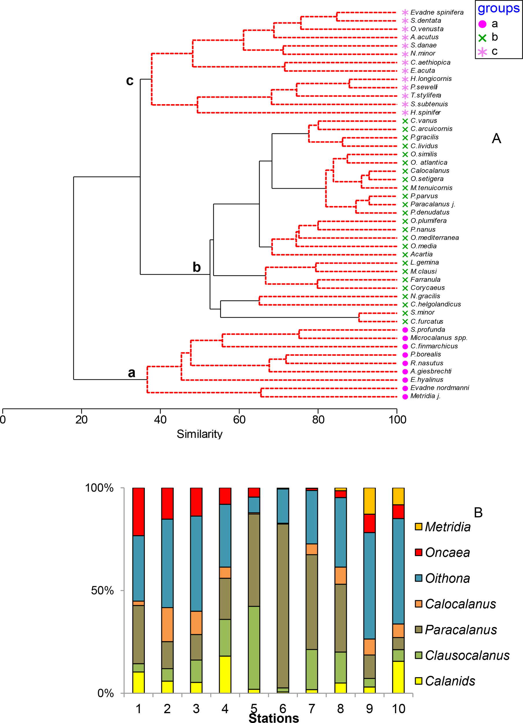 Dominant taxa (>1%) in the epipelagic layer across the transect. (A) Hierarchical clustering of the dominant copepod and cladocera taxa (ind·m-3) in the epipelagic strata indicating their presence at each area after fourth root transformation and a resemblance of Bray-Curtis similarity index and (B) dominant Copepods genera and all Calanids (%) at each station.