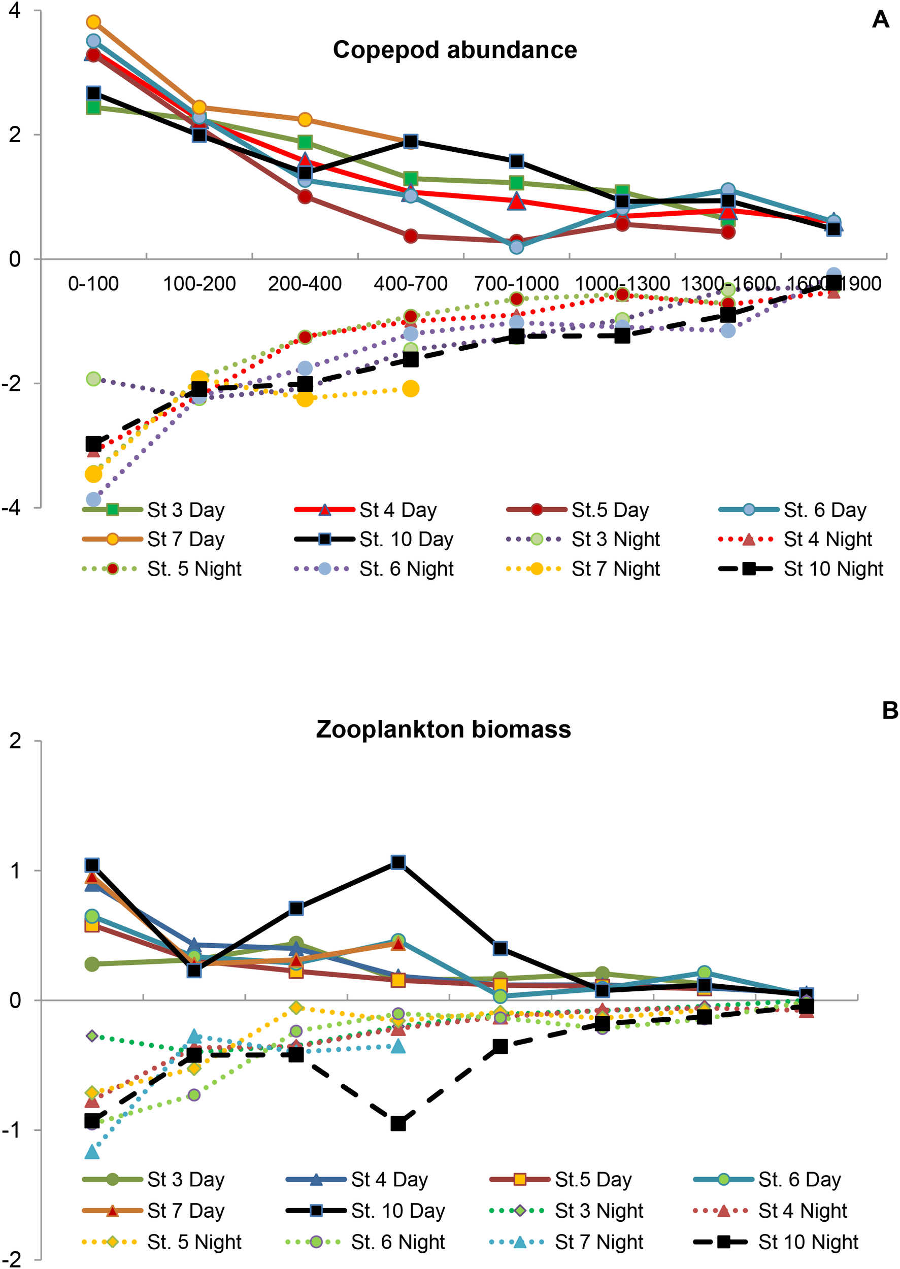 Vertical profiles of (A) abundance of Copepods as ind.m-3 and (B) Zooplankton biomass as mg.m-3 at the different stations analyzed (after Log transformed) from the epipelagic zone to 1900 m depth.