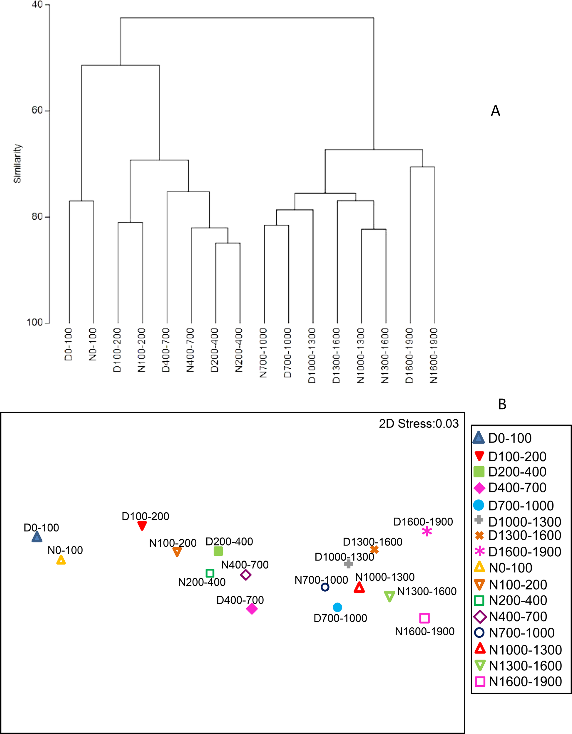 Zooplankton vertical distribution abundance (ind m−3). (A) Hierarchical clustering of the zooplankton community at each sampled layer and (B) non-metric MDS by day- (D) and nighttime (N), after averaging all stations, using fourth root transformation and a resemblance of Bray-Curtis similarity index.