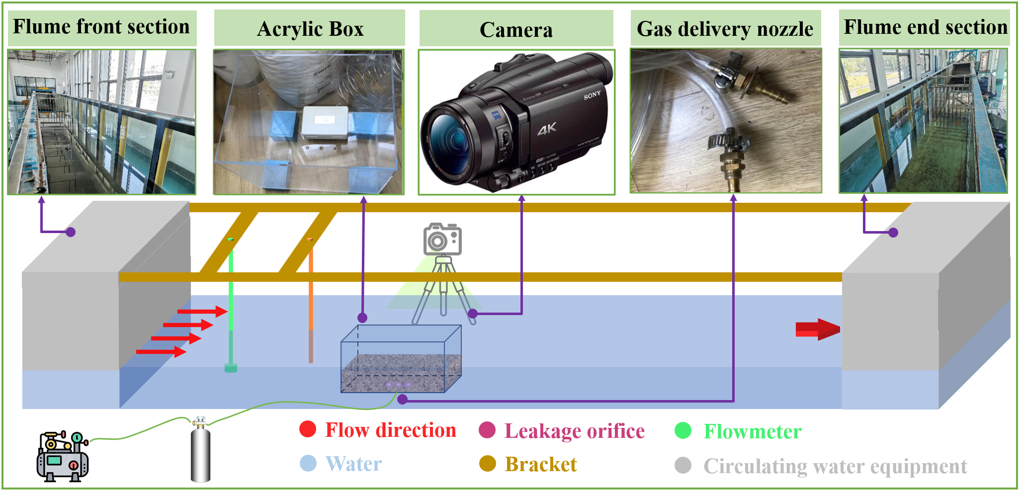 An experimental physical model was established to simulate shallow gas release and its ecological impacts, modified based on sediment-biology interactions. The experiment was conducted in a flume measuring 50 m in length and 1 m in width (Figure 1). To minimize soil usage, a transparent acrylic box measuring 40 cm by 30 cm by 30 cm was placed within the flume, filled with a sand-clay mixture at a 9:1 ratio and with a dry density of 1.65 to 1.80 g/cm³, simulating typical marine sediments. A compressed air system (0–700 kPa capacity) was used to simulate gas release, with pressures set at 100, 200, 300, 400, and 500 kPa. Release configurations included a single orifice (5 mm diameter) and two orifices (5 cm spacing), while burial depths were 10, 15, and 20 cm. CO2 gas was used to represent shallow gas in the test, as it is easy to prepare and has high safety.
