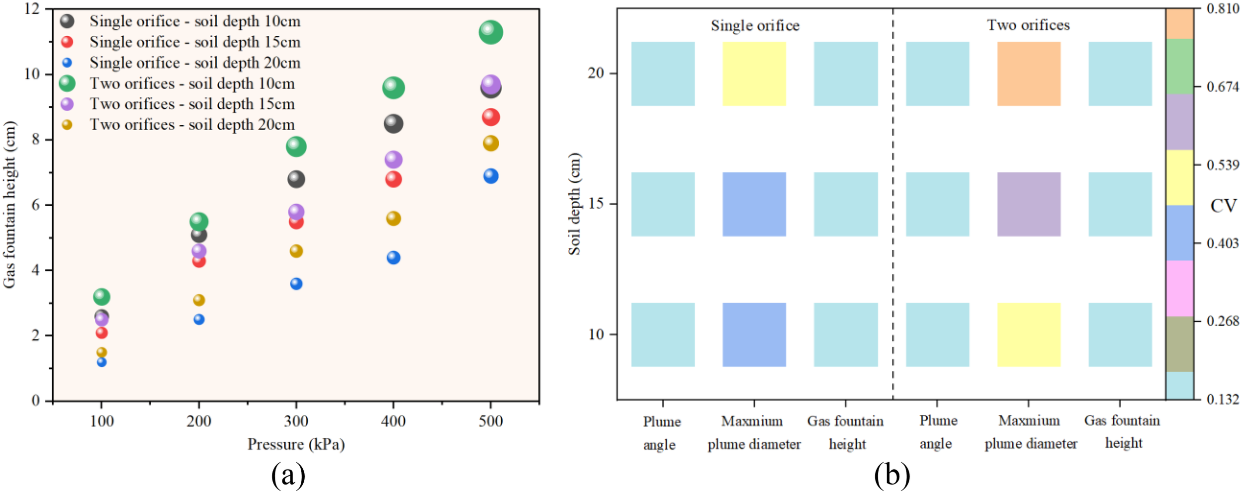Notable differences in CVs among parameters were observed: fountain height CV consistently exceeded those of plume diameter and cone angle, attributed to its dynamic measurement as an instantaneous jet extreme, which was more affected by gas pulse effects and soil resistance fluctuations. The spatial averaging characteristics of plume diameter and cone angle mitigated instantaneous fluctuations. The phenomenon of two-orifice CV exceeding single-orifice CV was more pronounced in high-pressure regions, resulting from the complexity of inter-orifice airflow interference, “orifice interference effects” caused by spacing uncertainty, and unequal flow distribution. Physically, increased Reynolds number at high pressure enhanced turbulence intensity, aggravating instantaneous fluctuations in the plume boundary layer. Meanwhile, high-speed jetting reduced the temporal resolution of optical measurements, and the influence of soil medium heterogeneity on gas migration increased with burial depth, collectively leading to rising CVs.