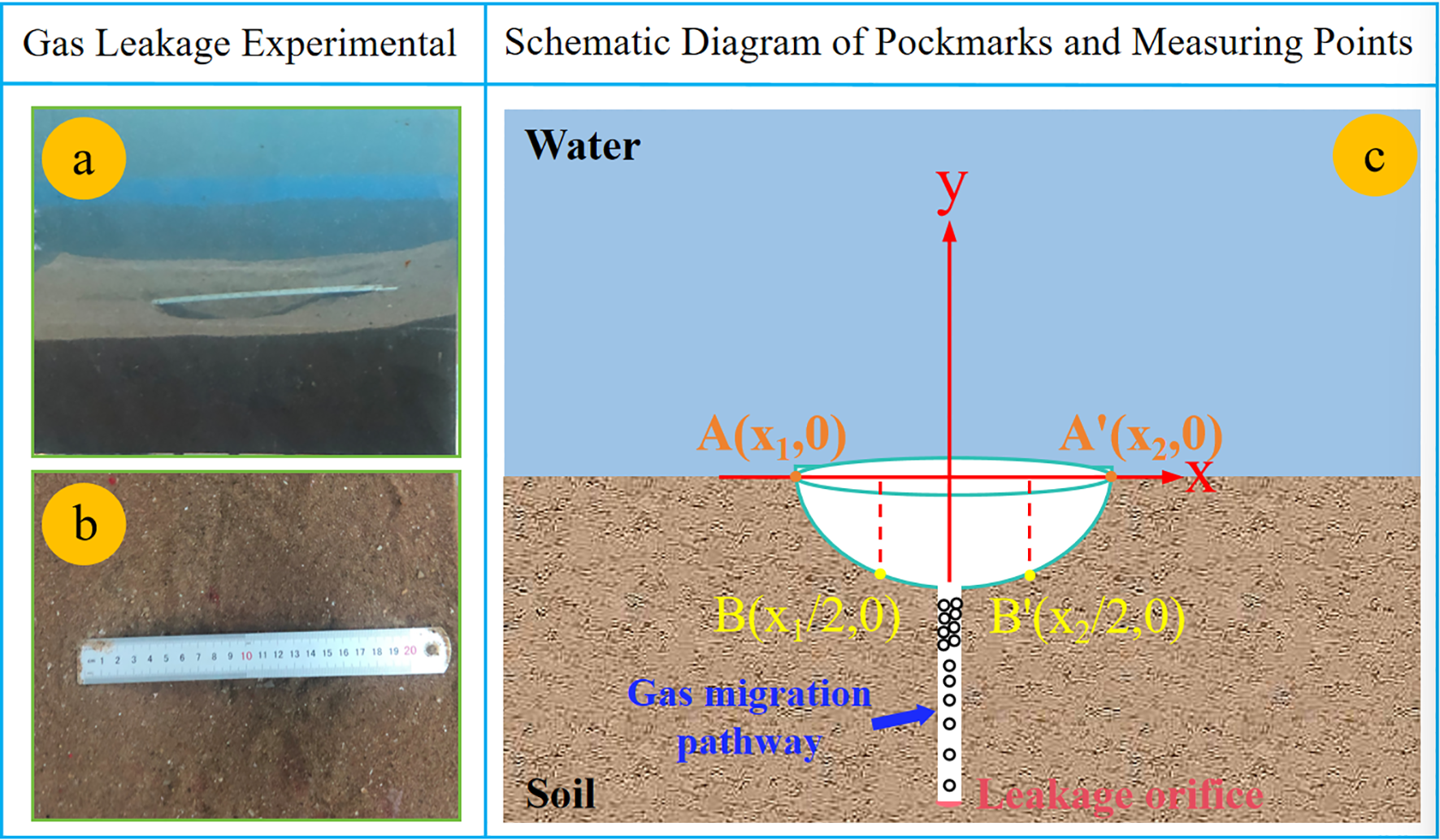 (a, b) Pockmark views during gas leakage experiments; (c) Schematic of pockmark and data sampling points.