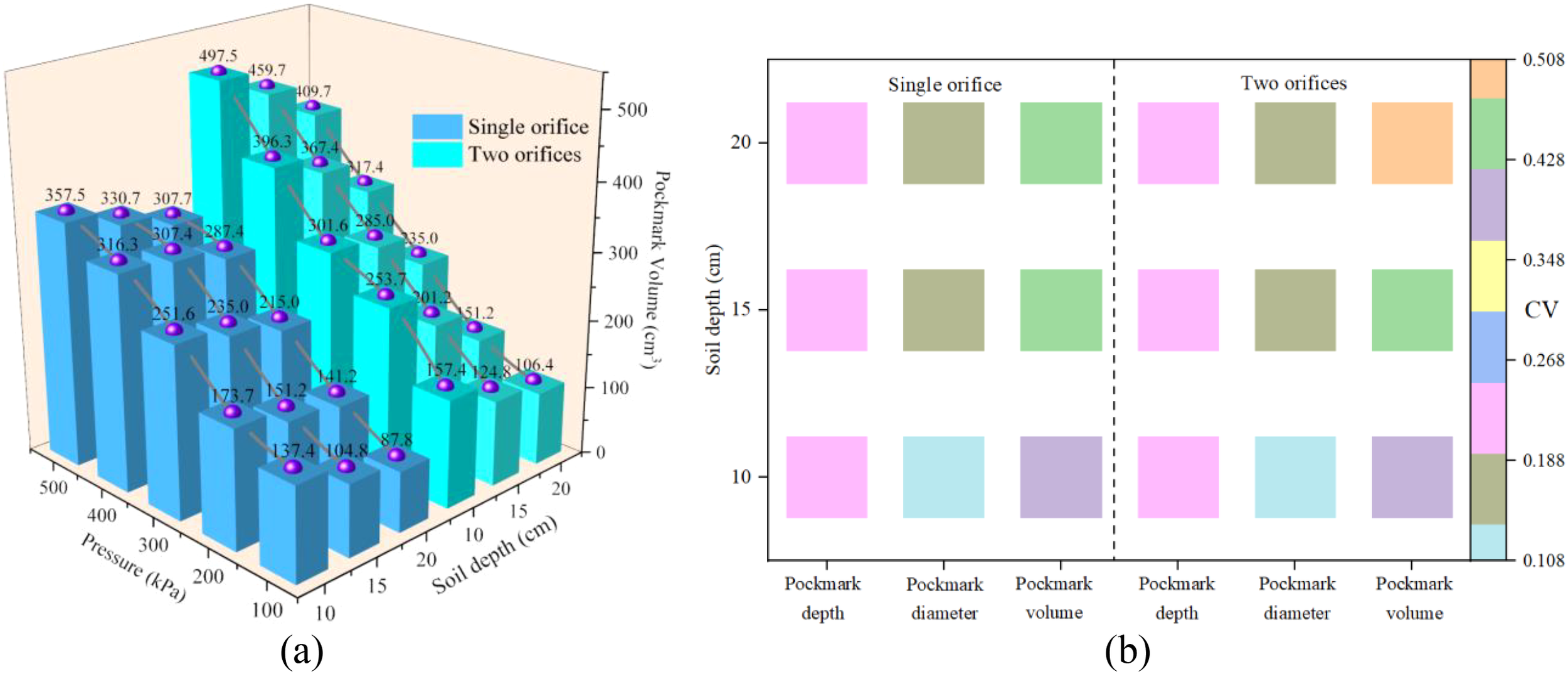 Pockmark volume, an intuitive indicator of habitat destruction, is shown in (Figure 8a) to be positively correlated with gas pressure and orifice number, and negatively correlated with burial depth. Gas release displaces sediments out of the model box via the plume, with higher pressure expanding the gas passage and driving more sediment movement. Two orifices increased gas flux and kinetic energy, expanding the breakthrough area and plume range to entrain more sediments. Deeper burial prolonged gas migration paths, consuming kinetic energy and reducing sediment entrainment capacity. (Figure 8b) shows higher coefficient of variation (CV) for pockmark diameter and volume than depth, with two orifice release causing more significant variations at greater depths. Affected by coupled parameters (depth and diameter), pockmark volume exhibited higher dispersion, influenced by gas pulse effects and soil resistance fluctuations