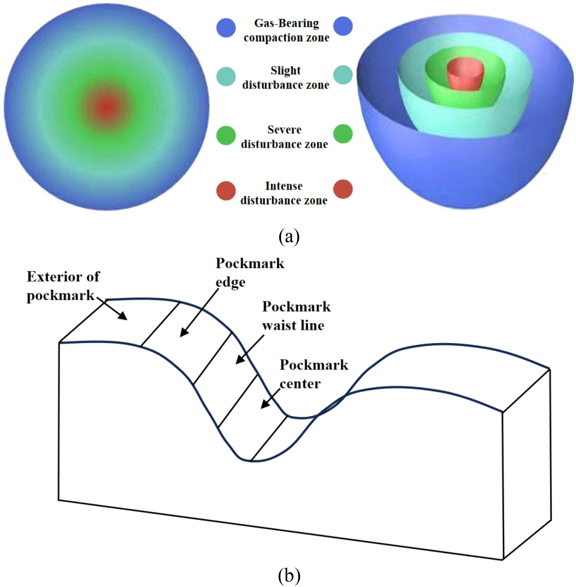(a) Schematic of disturbed soil zones; (b) Schematic of pockmark zoning.
