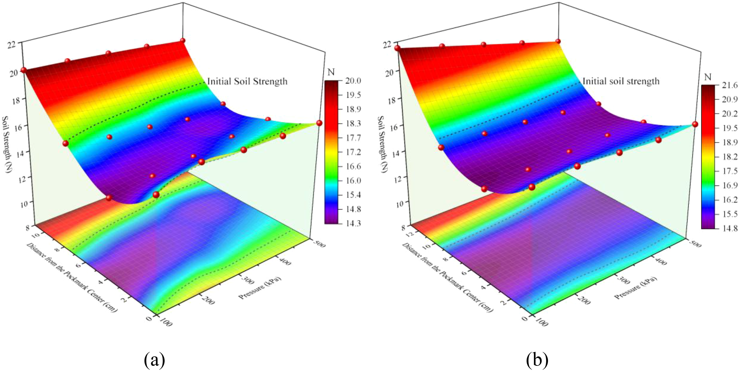 Fitting relationships among distance from pockmark center, pressure, and soil strength: (a) single orifice; (b) two orifices.