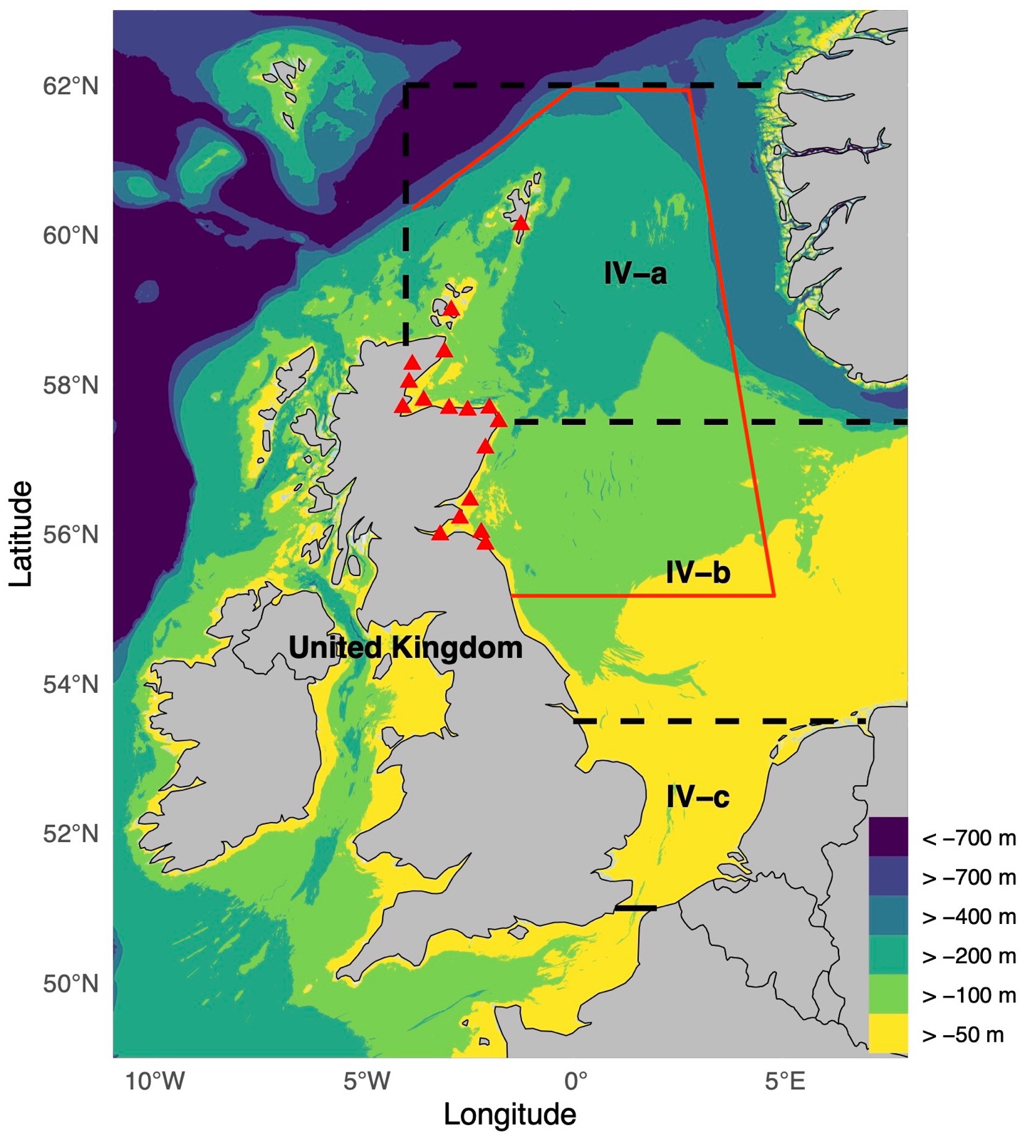 Study area: East Coast of Scotland (ECS). The red line indicates the approximate spatial extent of the ECS modelling area, based on historical fishing grounds of the Scottish fleet. The red triangles indicate fishing ports along the ECS. The ICES divisions of the northern North Sea (IV-a) and southern North Sea (IV-b and IV-c), which together comprise the North Sea, are outlined with black dashed lines. Colours indicate depth intervals. Fishing ports, from south to north along the Scottish coastline, include Eyemouth, Leith, Anstruther, Montrose, Stonehaven, Aberdeen, Peterhead, Fraserburgh, Banff, Buckie, Findhorn, Cromarty, Helmsdale, Lybster, Wick, and the Orkney and Shetland Islands.