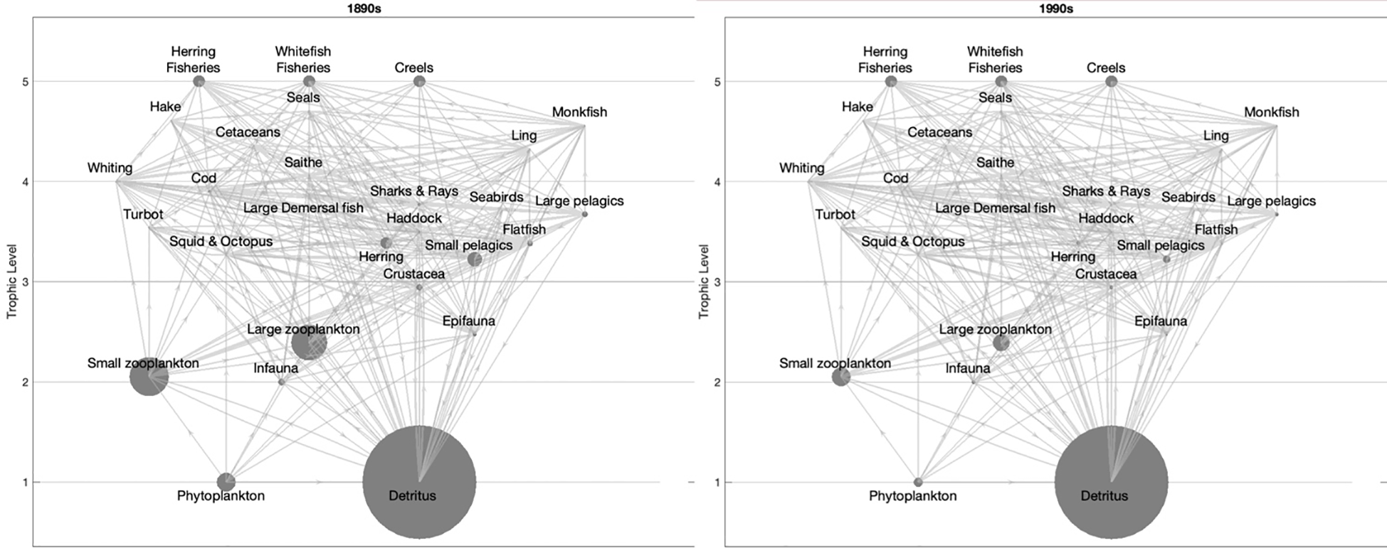 Flow diagram of the East Coast of Scotland in the 1890s (left) and 1990s (right). The size of the circles indicates the biomass of functional groups.