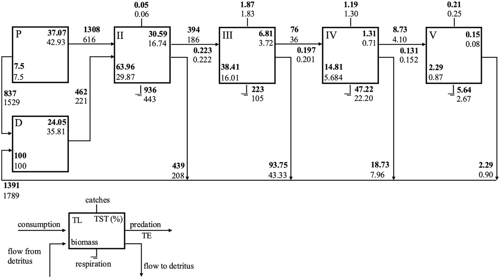 | Total system throughput (TST) | 5860 | 5031 | t km-2 y-1 |