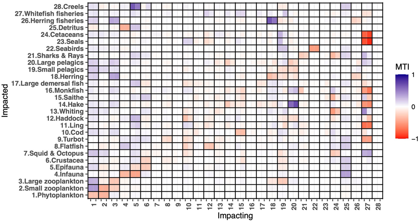 Mixed trophic interactions within the food web were investigated using mixed trophic impact analysis, a method based on the information theory. Mixed trophic impact analysis quantifies the relative direct and indirect impacts of any functional group, including fisheries, on another group by simulating a hypothetical biomass increase while assuming that the overall trophic structure of the system remains unchanged (Ulanowicz and Puccia, 1990). Additionally, the cumulative impact derived from mixed trophic impact analysis represents the overall influence of a group throughout the food web. Together with keystoneness (Power et al., 1996), this identifies functional groups that are particularly important for maintaining the ecosystem structure and function. Keystone groups play a crucial structuring role in ecosystems, despite their relatively low biomass (Libralato et al., 2006).