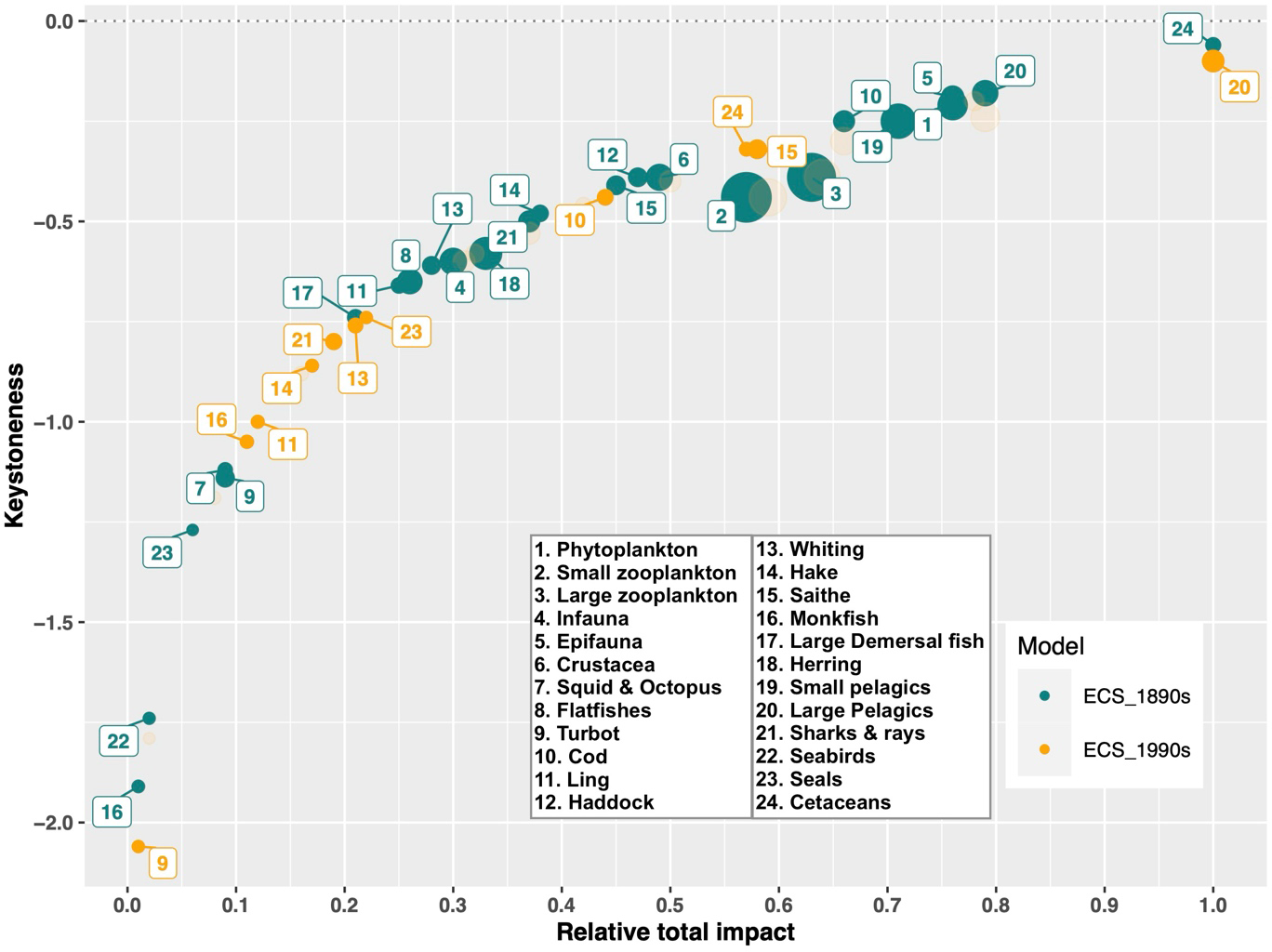 To ensure comparability, identical food web topologies were maintained in both models, meaning that the number of functional groups described and links among them remained consistent. This approach enables direct comparisons of indicators between the 1890s and 1990s food webs at both ecosystem and functional group levels.