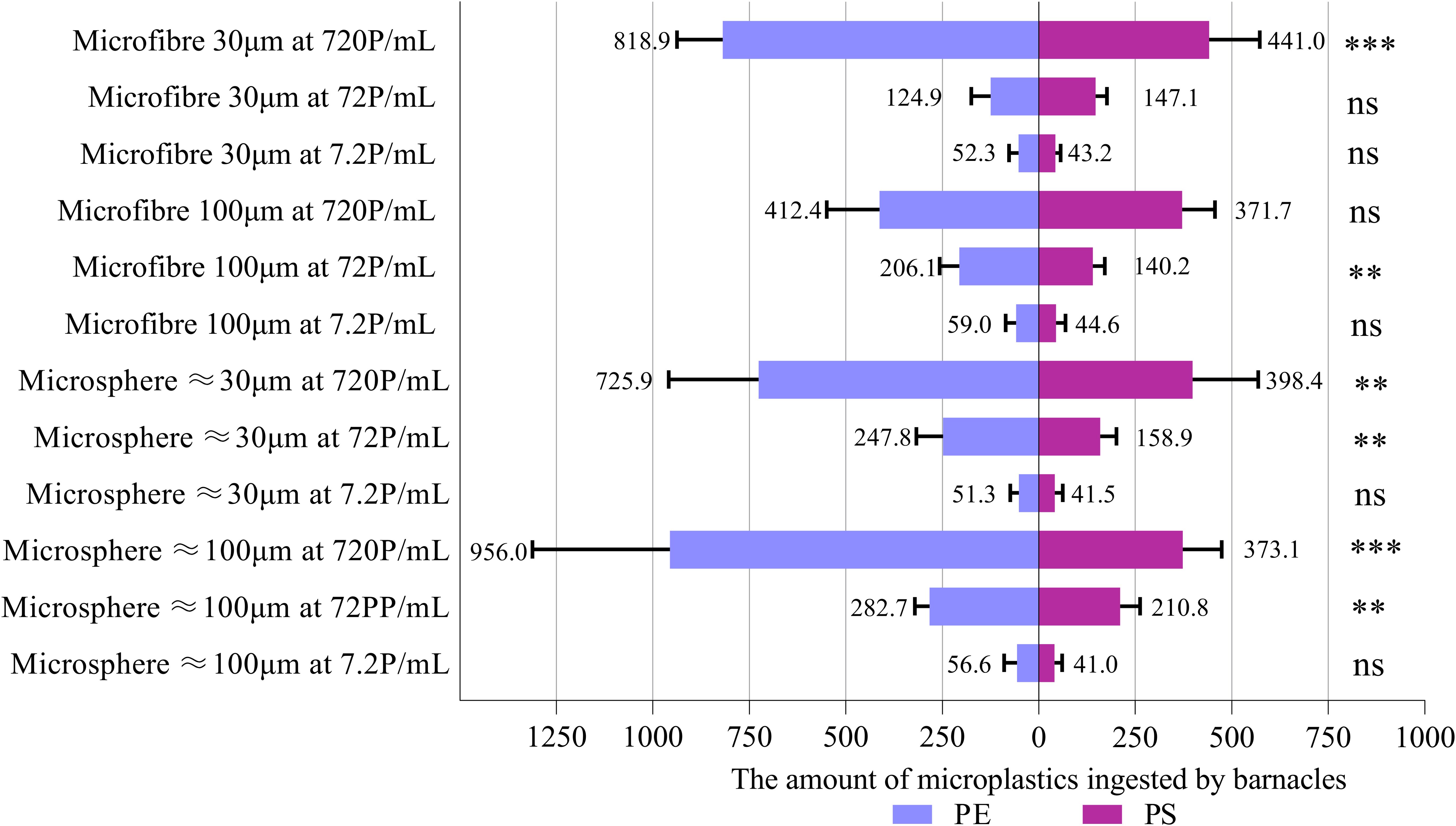 Figure 2. Comparisons between the ingestion (number of MPs collected in the body and feces) of PE MPs and PS MPs using paired t-test. Data are means (+ SD) of 10 replicates, and the number of MPs refers to the sum of 10 barnacles in the same experimental chamber. **P<0.01, ***P<0.001, ns, not significant.