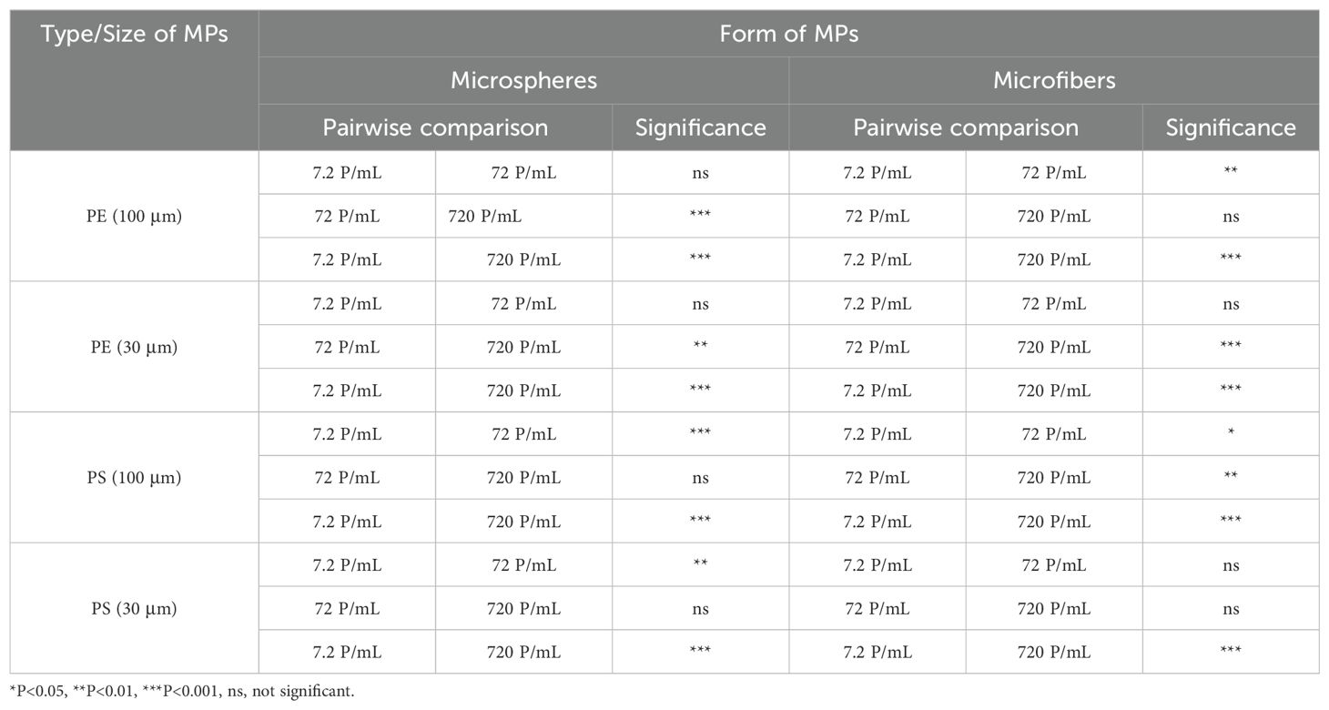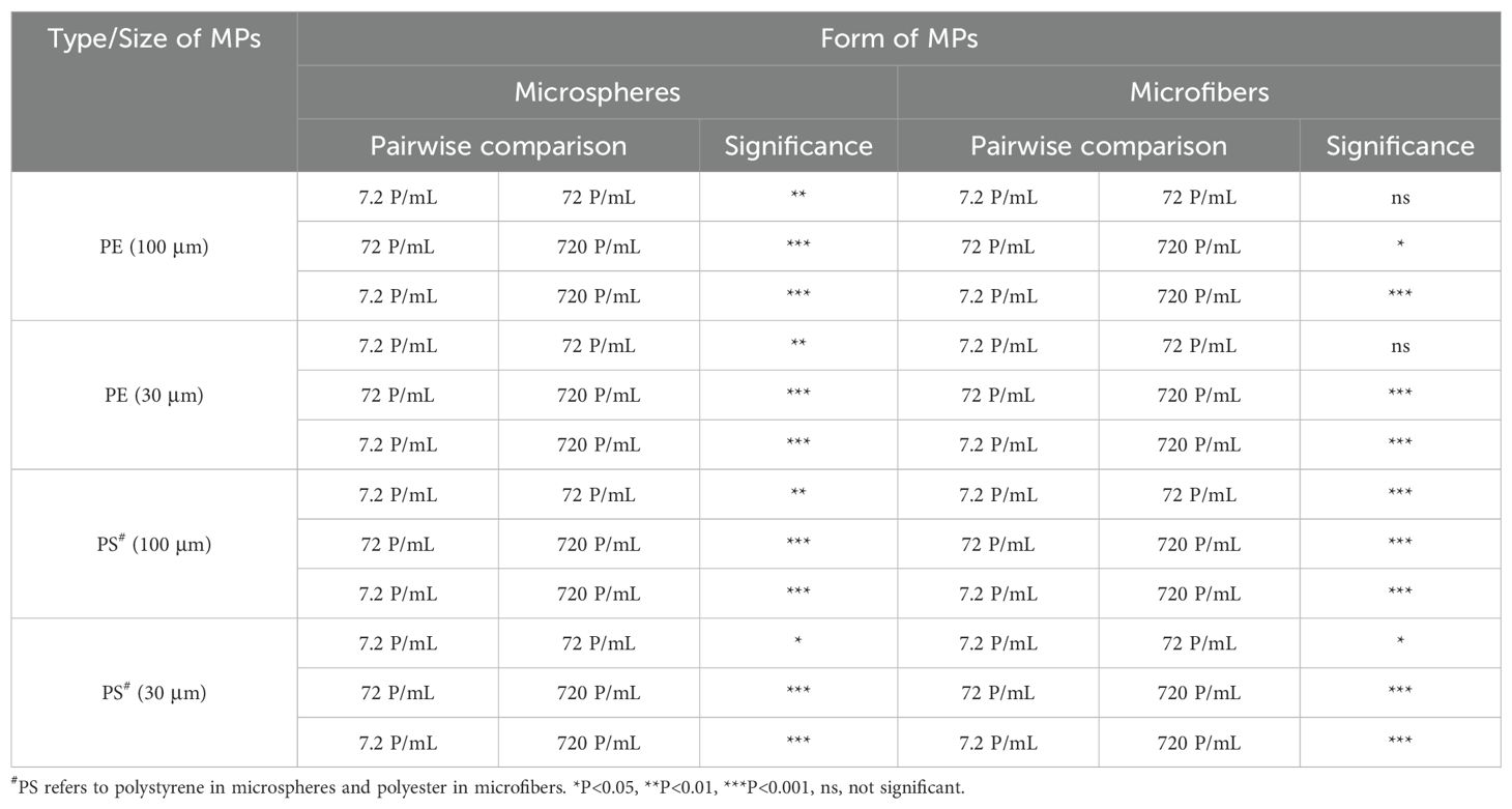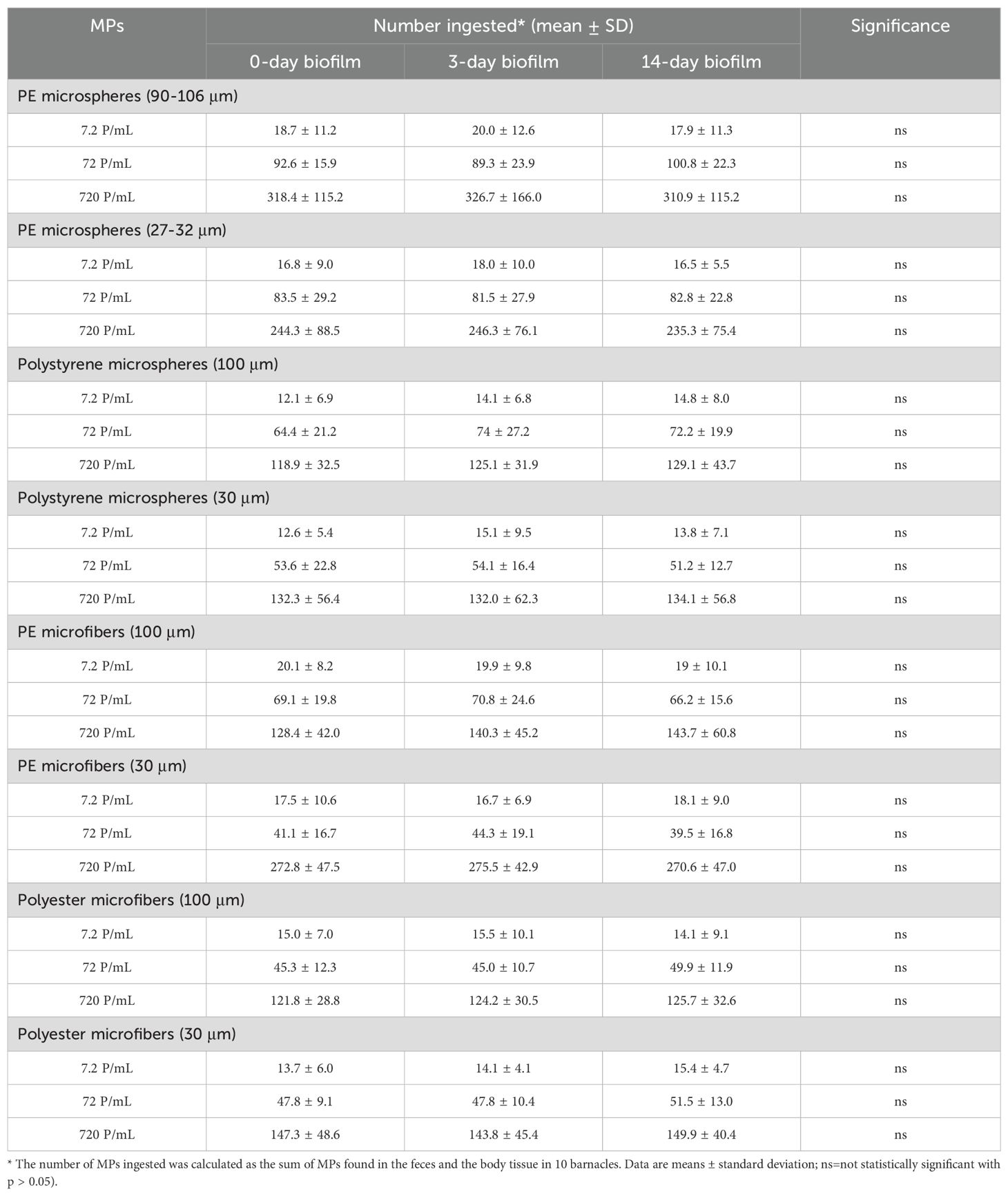 The number of MPs accumulated in the body as a function of the concentration and form of MPs was determined for each type and size of MPs. Due to the interactive effect between the concentration and form of MPs, the effect of MPs concentration was studied separately for each form of MPs (Table 3). In most of the cases, the number of microspheres and microfibers accumulated by A. amphitrite was concentration-dependent for each size group of PE and PS. The number of both size groups of PS microspheres accumulated in the body, however, was not significantly different between two higher MP concentrations, i.e., 72 and 720 p/mL. The same was also observed for 30 µm polyester microfibers and 100 µm PE microfibers. The number of microfibers accumulated in the body was similar to that of microspheres, except for 30 µm and 100 µm of PS and 30 µm of PE, at which more microspheres were accumulated (Figure 3). Barnacles exposed to 30 µm PS microspheres at 7.2 P/mL accumulated the smallest number of MPs in the body (13.6 particles per group, or 1.36 particles per individual) while those exposed to 30 µm PE microfibers at 720 P/mL accumulated the highest number of MPs (441.8 particles per group, or 44.18 particles per individual). The number of PS and PE MPs accumulated in the body of barnacles was similar, except at the highest concentration at which more PE MPs were accumulated (Figure 4).This study utilized ten replicates per treatment group, a sample size consistent with established experimental designs in microplastic ingestion research (e.g., Browne et al., 2008; Cole et al., 2013). This replication level provides robust detection of moderate to large effect sizes, as demonstrated by statistically significant outcomes in key endpoints like ingestion rate. Based on effect sizes reported in comparable studies (e.g., Wright et al., 2013), our design had adequate power (≥ 0.8) to detect differences in ingestion rates exceeding 20%.