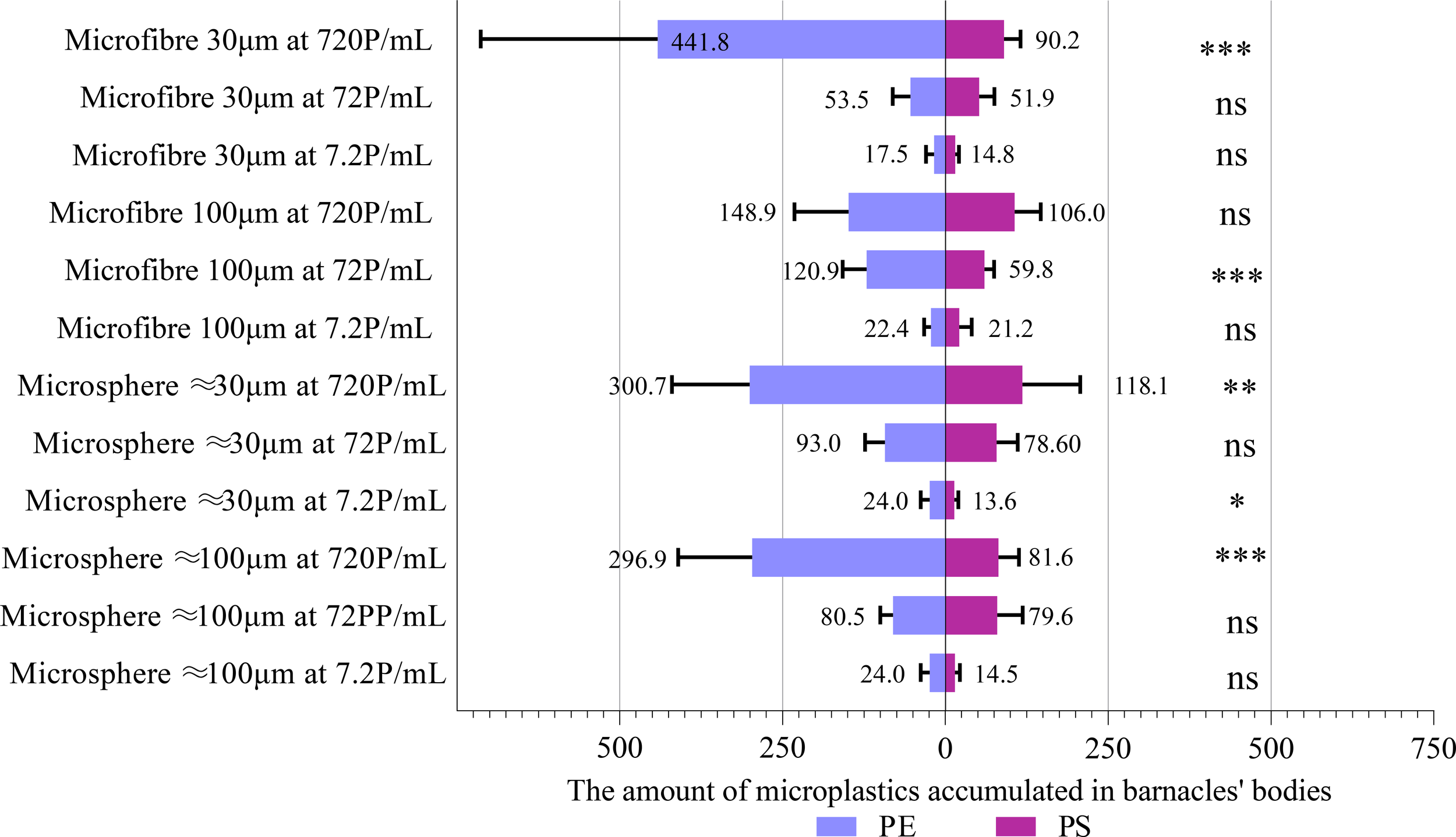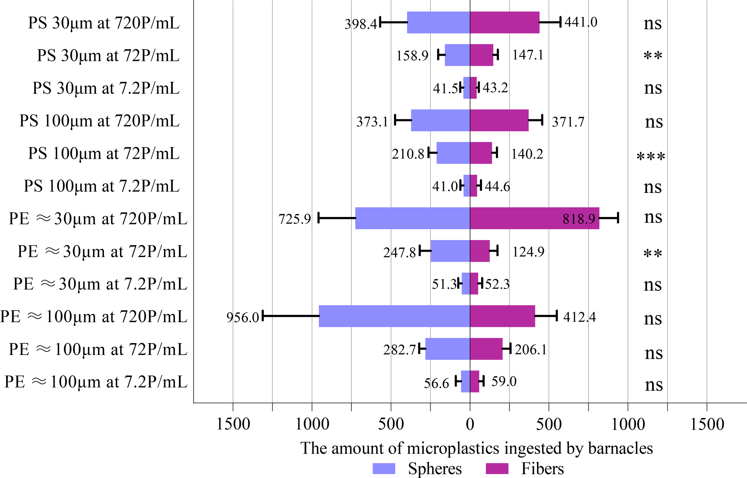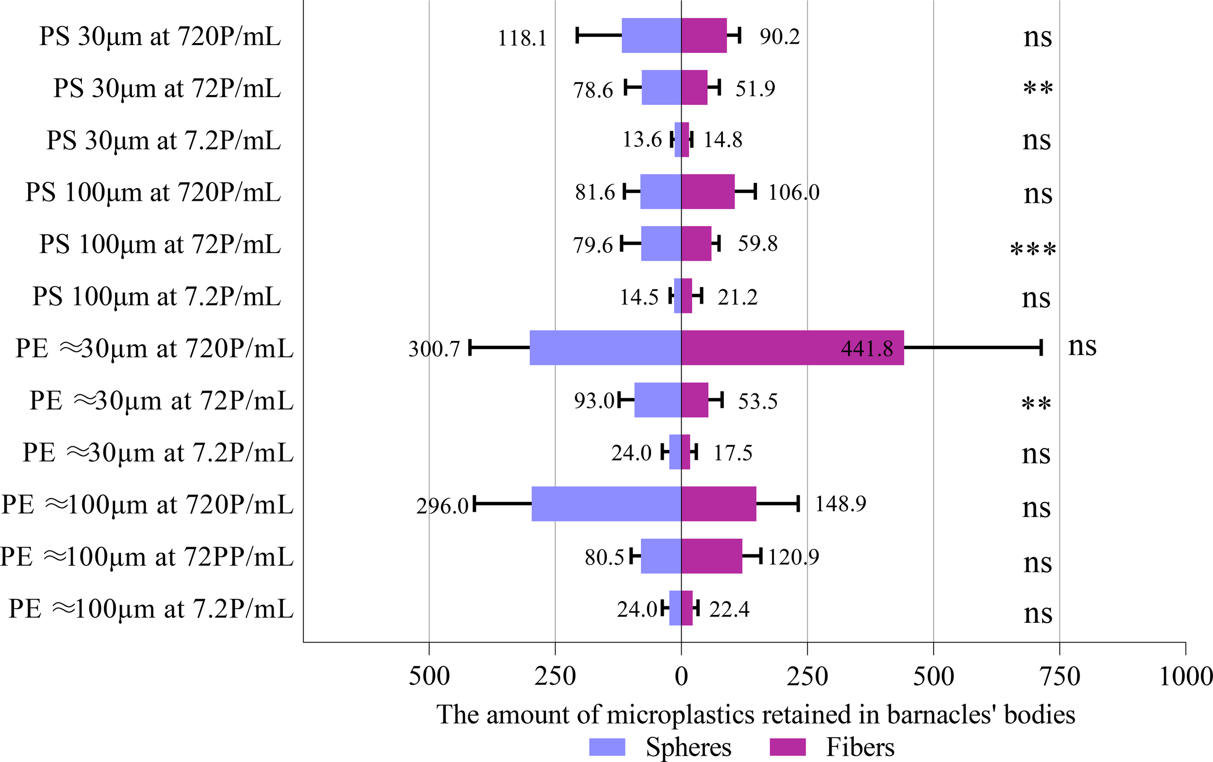 * The number of MPs ingested was calculated as the sum of MPs found in the feces and the body tissue in 10 barnacles. Data are means ± standard deviation; ns=not statistically significant with p > 0.05).