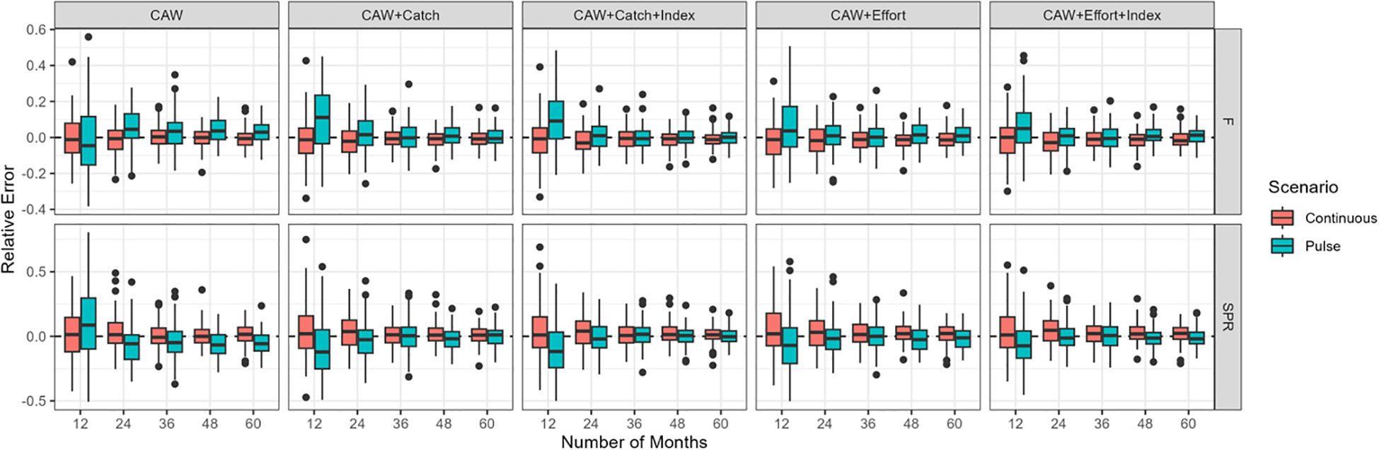 Figure 2. The relative error in fishing mortality (top row) and spawning potential ratio (bottom row) for two recruitment patterns (continuous – red or pulsed – blue) and 12–60 months of time-series data (x-axis). The five columns display the simulation results from five potential combinations of available time series data; 1) weight composition only (CAW), 2) CAW and an index of catch, 3) CAW and indices of catch and abundance (i.e. CPUE), 4) CAW and an index of fishing effort, and 5) CAW and indices of effort and abundance. The model was not fit to indices of effort, catch, and abundance, because the index of abundance is generated from the catch and effort data.