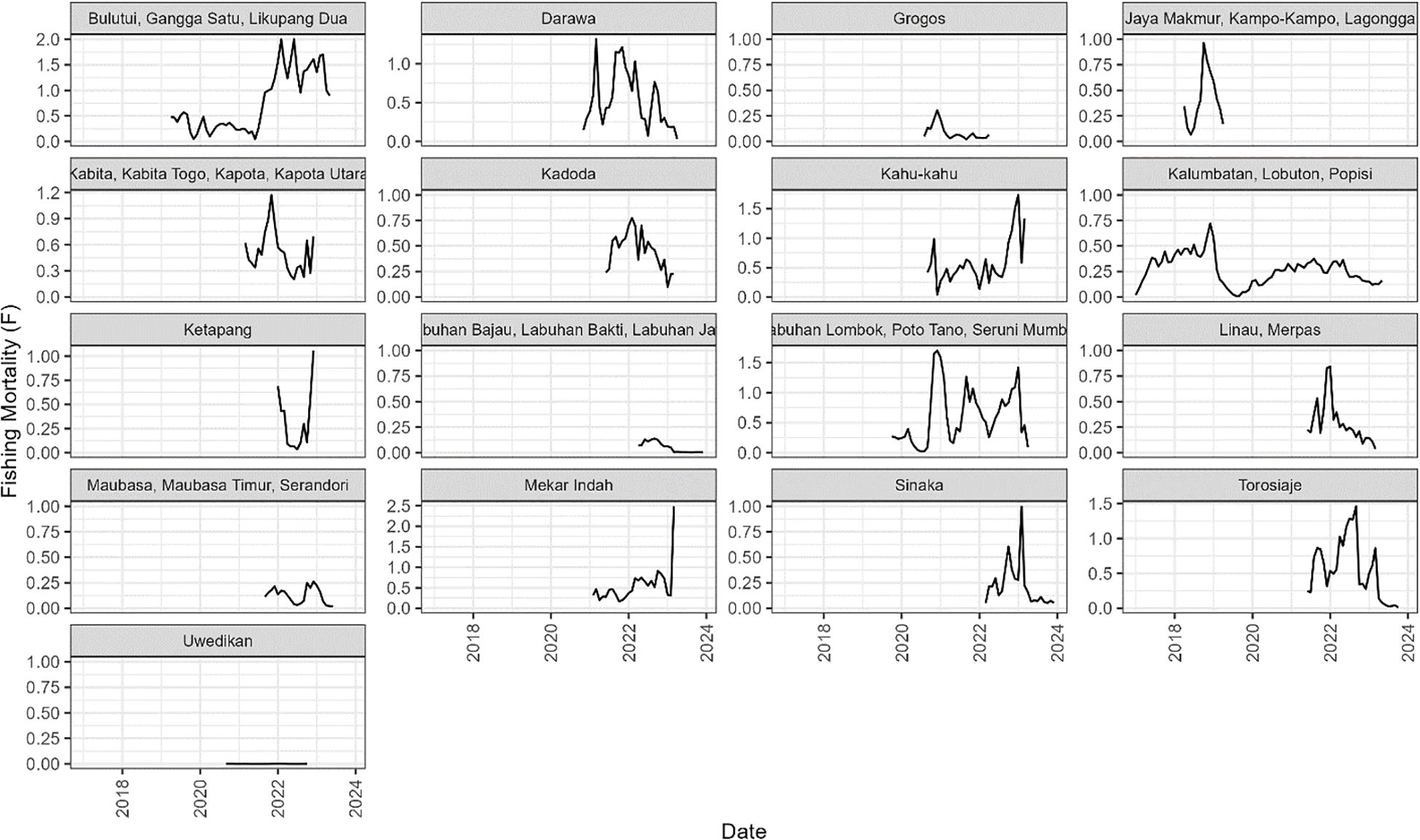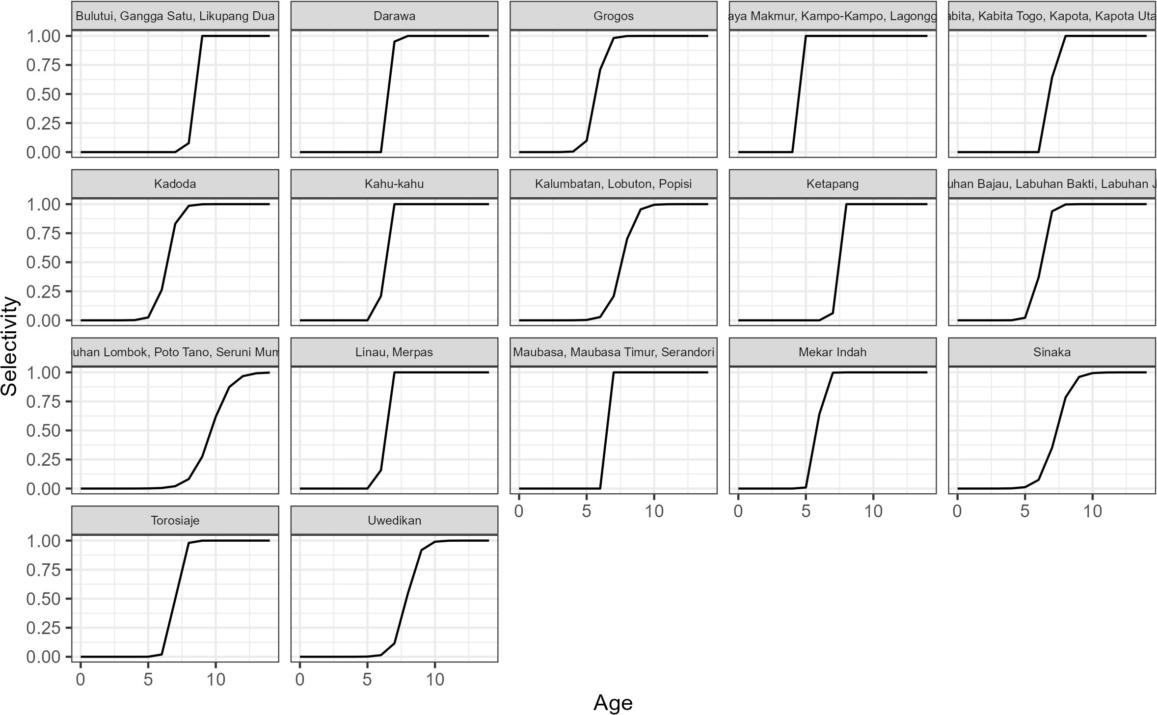 Estimates of F varied widely across sites, and between months within the 17 sites (Figure 3); in some cases being >1.0 (Bulutui, Gangga Satu, Likupang Dua), but ~0 for all months in Uwedikan, and in some months at many sites including Labuhan Lombok. In contrast the estimated selectivity-at-age curves were quite similar for most of the sites, although larger at the site that includes Labuhan Lombok, and smaller at site that includes Jaya Makmur (Figure 4).