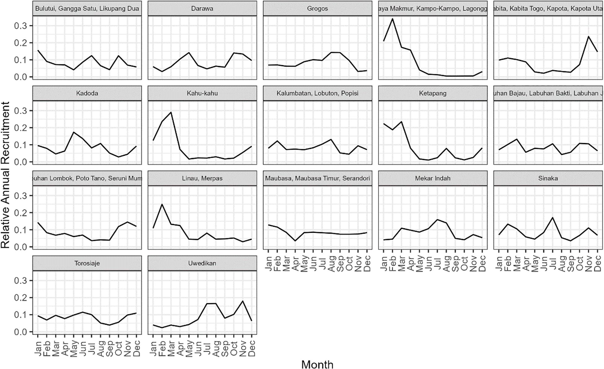 The seasonal recruitment pattern was estimated to be relatively flat for most of the sites, although there was evidence of a recruitment pulse around February at some sites (Figure 6).