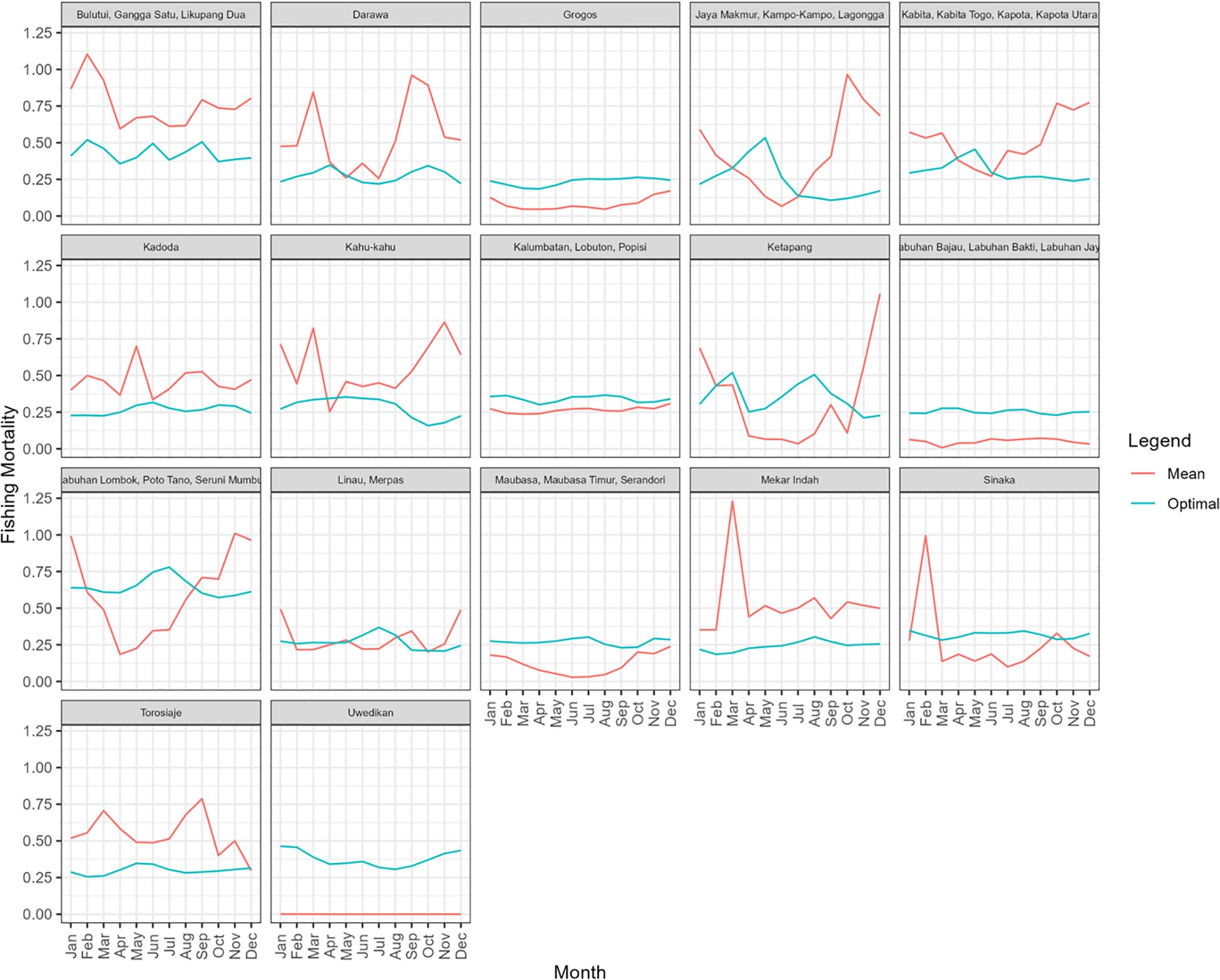 For most sites, the HARA model predicted a relatively flat optimal fishing pattern throughout the year, suggesting that utility from the fishery is maximised with relatively constant fishing pressure throughout the year (Figure 7). The exceptions were the sites with a seasonal recruitment pulse (e.g., the site of Jaya Makmur and associated villages; Figure 7). In these sites, the HARA model predicted greater utility would be achieved by increasing the fishing effort around May, about three months after the February peak of recruitment (Figure 6) and a similar optimal pattern in SPR (Figure 7).