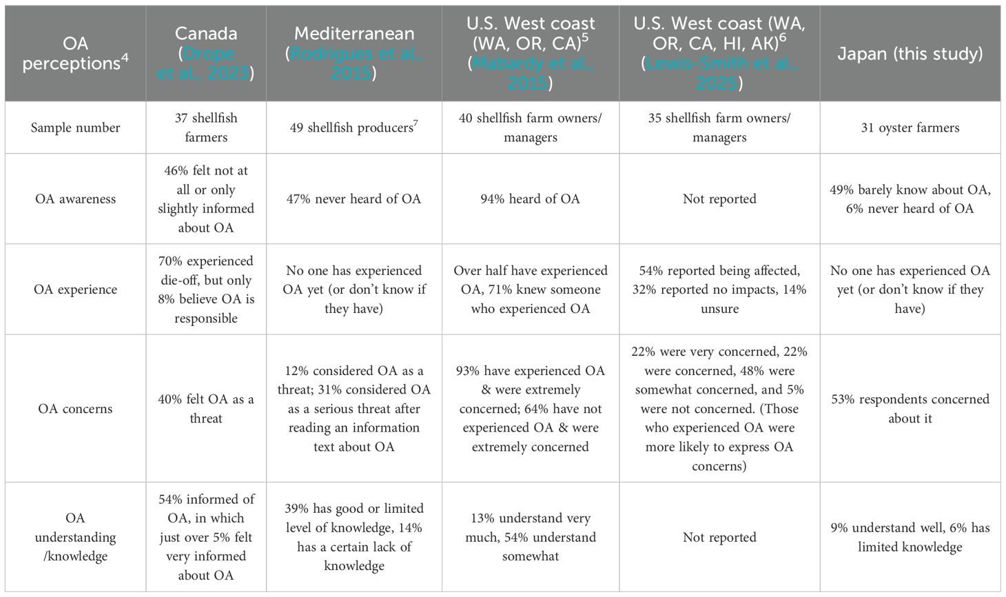Studies reporting global perceptions of OA from shellfish farmers were available from Canada (Advani and Satterfield, 2024; Drope et al., 2023), the U.S (Mabardy et al., 2015; Lewis-Smith et al., 2025), the Mediterranean (Rodriguez et al., 2015), and Hinase, Japan (this study). Supplementary Table 1 lists the shellfish species cultured in each study. Extremely high awareness of OA (94% of the respondents) was found in U.S. shellfish farmers (Mabardy et al., 2015); half of these farmers had experienced OA in their own businesses in both survey years of 2013 and 2023-2024 (Table 1). In contrast, 46-55% of the interviewed shellfish farmers in Canada, Japan and Mediterranean areas had either never heard of, or barely knew about OA, and few farmers in these regions reported shellfish mortality directly associated with OA (Table 1). Almost all U.S. shellfish farmers (93%) were extremely concerned about OA in 2013 (Mabardy et al., 2015), yet this declined 22% in 2023-2024 (Lewis-Smith et al., 2025). Despite lower awareness/experience of OA in non-U.S. countries, a relatively high percentage (40–53%) of these farmers expressed concerns about OA as a threat. Overall, 67% of U.S. farmers reported understanding OA “very well” or “somewhat” in 2013 (Mabardy et al., 2015), versus 54% (Canadian farmers), 39% (Mediterranean farmers), and 15% (Japanese farmers).