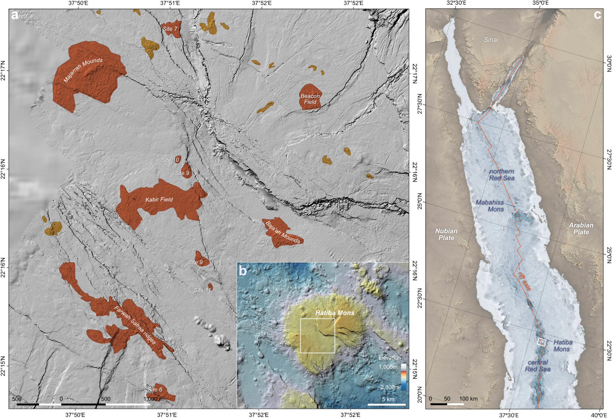 Overview of the hydrothermal vent fields on the summit of Hatiba Mons volcano. (a) AUV map showing confirmed (orange) and inferred (yellow) vent sites of the central summit area. (b) Ship bathymetry of the Hatiba Mons volcano and the close vicinity. (c) The location of Hatiba Mons in the tectonic framework of the northern and central Red Sea.