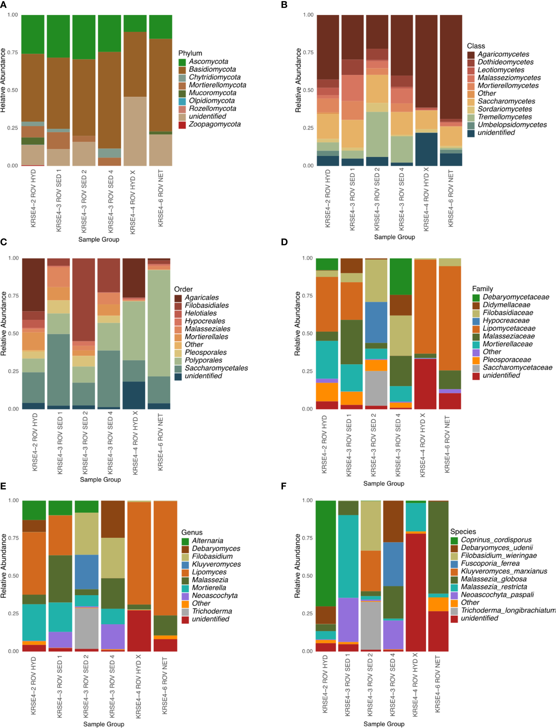 The relative abundance of fungal communities across taxonomic levels in Red Sea hydrothermal vent samples. Composition is displayed at the (A) Phylum, (B) Class, (C) Order, (D) Family, (E) Genus, and (F) Species levels for sediment and mat samples from different ROV deployments. Only the top 10 taxa are shown per level; others are grouped as “Other”, and unclassified reads as “unidentified”. Color schemes are consistent within each level.
