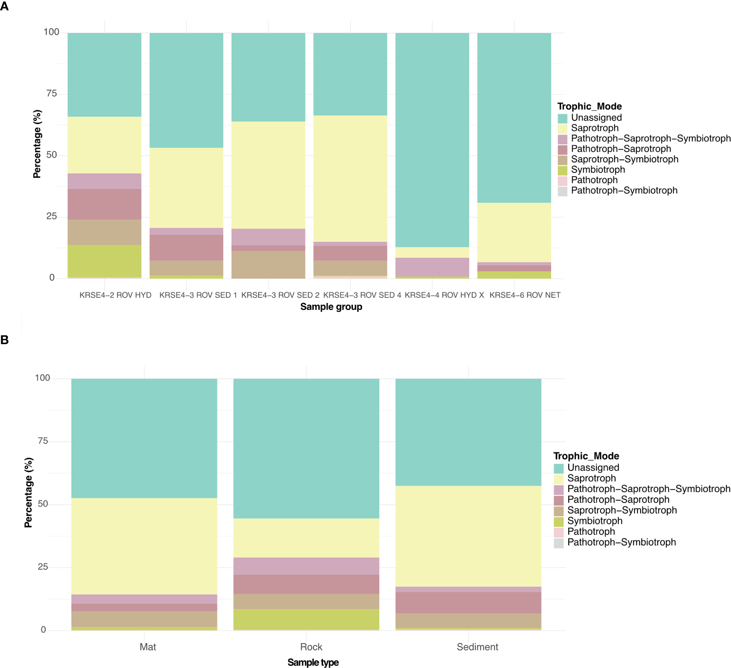 Stacked bar plot showing the relative proportion (y-axis) of the predicted fungal functional guilds across hydrothermal vent sites location (A) and samples type (B) (x-axis). The bars represent the percentage of sequence reads assigned to each trophic category.