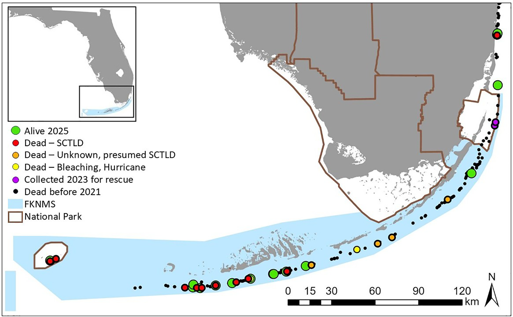 This disastrous decline resulted in the functional extinction of the species in Florida, with only a handful of survivors scattered across the reef tract and essentially no chance for successful reproduction in the wild. From 2021 to 2025, we continued to monitor the remaining colonies for continued decline or potential recovery and also updated the Florida D. cylindrus database when previously unknown colonies (live or dead) were found.
