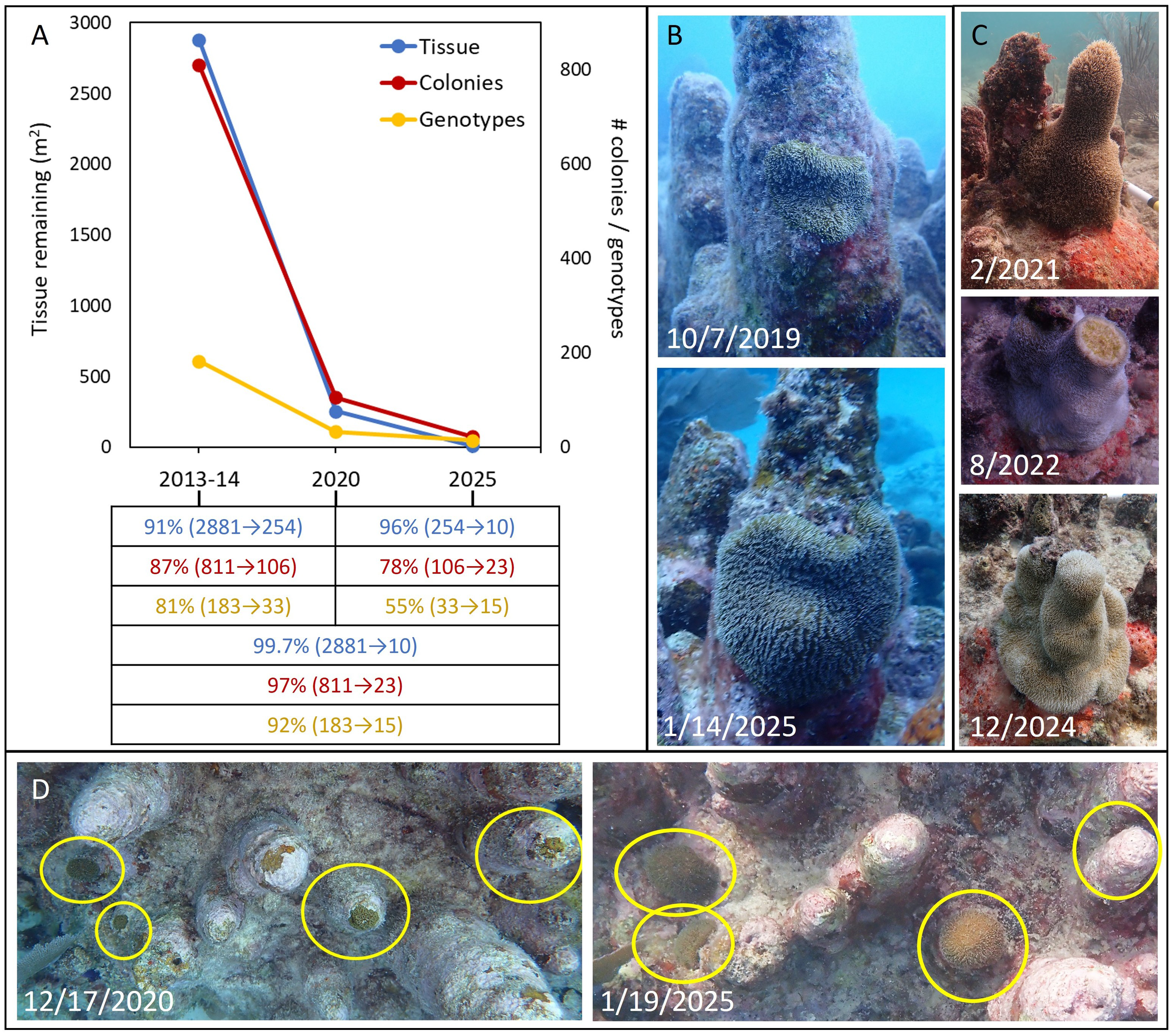 Monitoring of survivors from 2021 to 2025 documented continued declines in coral tissue and the number of living colonies and genotypes (Figure 2A). From 2021 to 2025, the amount of living D. cylindrus tissue on Florida’s Coral Reef decreased by an additional 96%, for a total loss of at least 99.7% since the 2013 baseline surveys. The number of surviving colonies also continued to decline, with a 78% loss of colonies between 2021 and 2025, and a total loss of 97% since the baseline surveys. Similarly, the number of surviving genotypes declined by an additional 55% from 2021 to 2025 for a total loss of 92% since the baseline surveys.