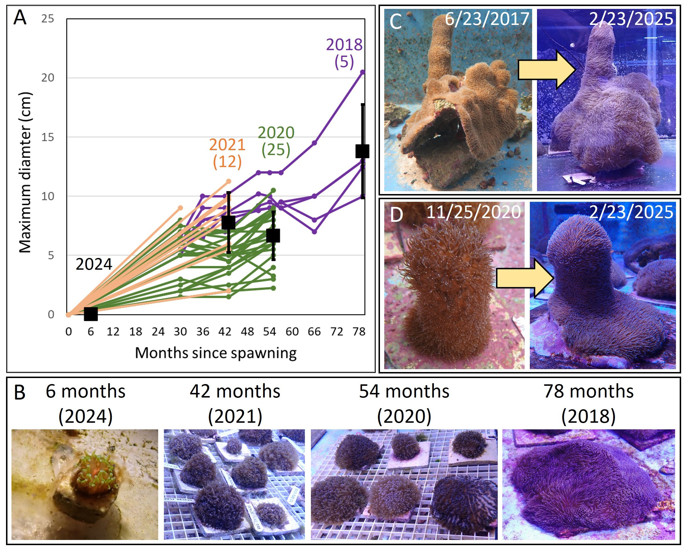 In February 2025, sexual recruits that had settled 6 months prior (the 2024 cohort) measured between 1.5 and 4 mm in maximum diameter (Figures 3A, B). Recruits from 42 and 54 months earlier (the 2020 and 2021 cohorts) ranged from 2 to 11 cm, and those spawned 78 months earlier (the 2018 cohort, whose larvae spawned at the Keys Marine Lab and transported to the CCRC) ranged from 10 to 21 cm. Assuming a linear growth rate, the maximum diameter of sexually spawned individuals increased by 1.8 mm/month from settlement to 6.5 years of age. Three settlers from the 2018 sexually produced cohort spawned as males in 2024 (sizes at spawning: 9.5 cm × 8 cm × 8 cm, 10 cm × 10 cm × 5.5 cm, and 14.5 cm × 13 cm × 5 cm). Rescue project fragments collected in situ and held at the CCRC also exhibited notable growth (Figures 3C, D).