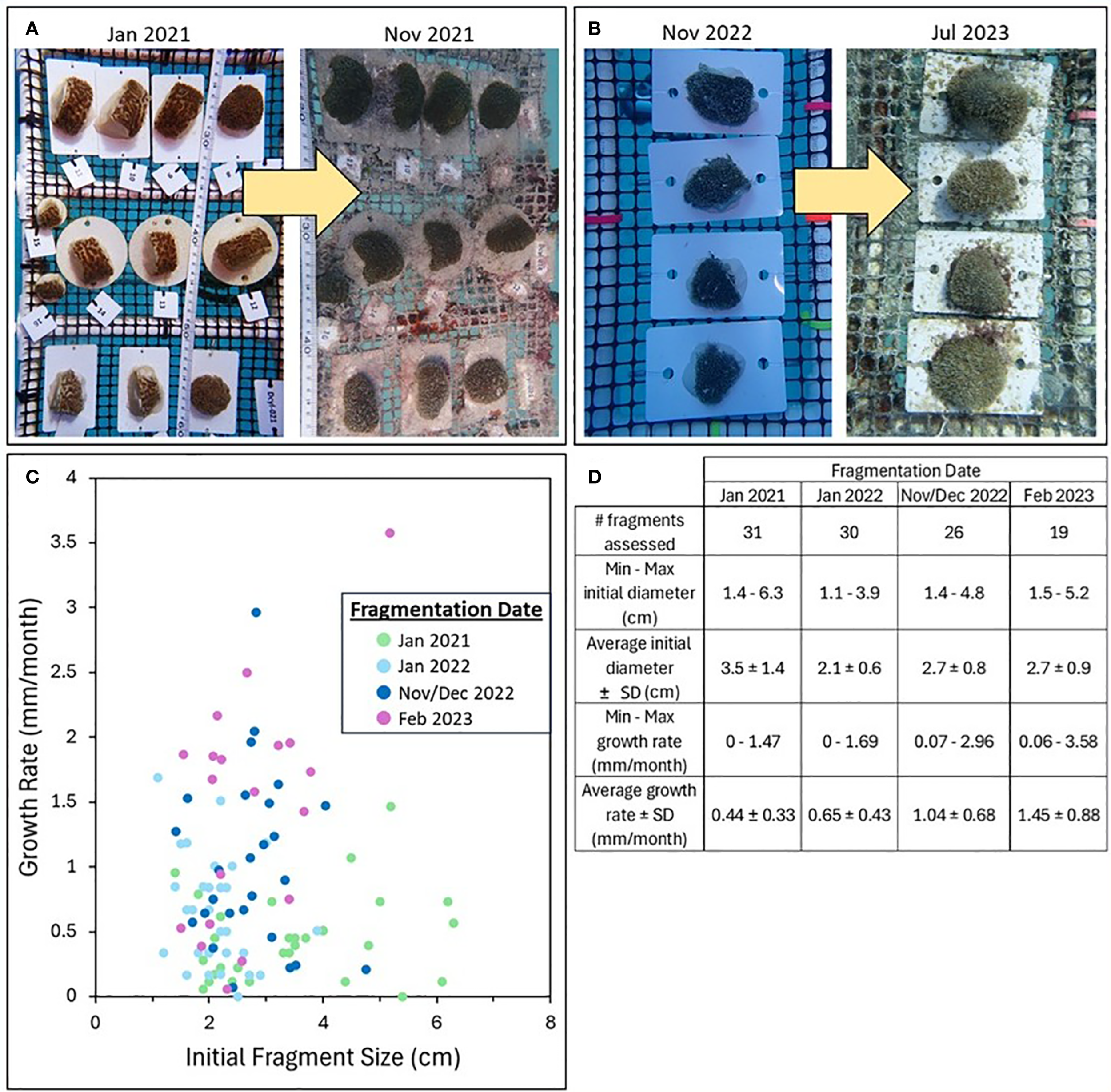 We assessed the growth rates of each fragment by comparing the initial fragmentation diameter to the most recent diameter measurement (taken 147–539 days after fragmentation) and dividing the number of days between the two assessments. The maximum diameter of each fragment from the January 2021 to January 2022 propagation events was measured using calipers. Fragments produced from the November 2022 to February 2023 events were measured using top-down photographs, which were assessed for total surface area using ImageJ, and then the diameter was recalculated based on the assumption of a circular area. Any corals for which partial or full mortality was observed, or for which the end maximum diameter was smaller than the initial diameter, were discarded from the dataset as non-representative of normal growth rates. We used multiple regression to assess correlations between the growth rates and 1) the maximum diameter of the newly cut fragments and 2) the date of fragmentation (with dummy values for each of the four fragmentation events).