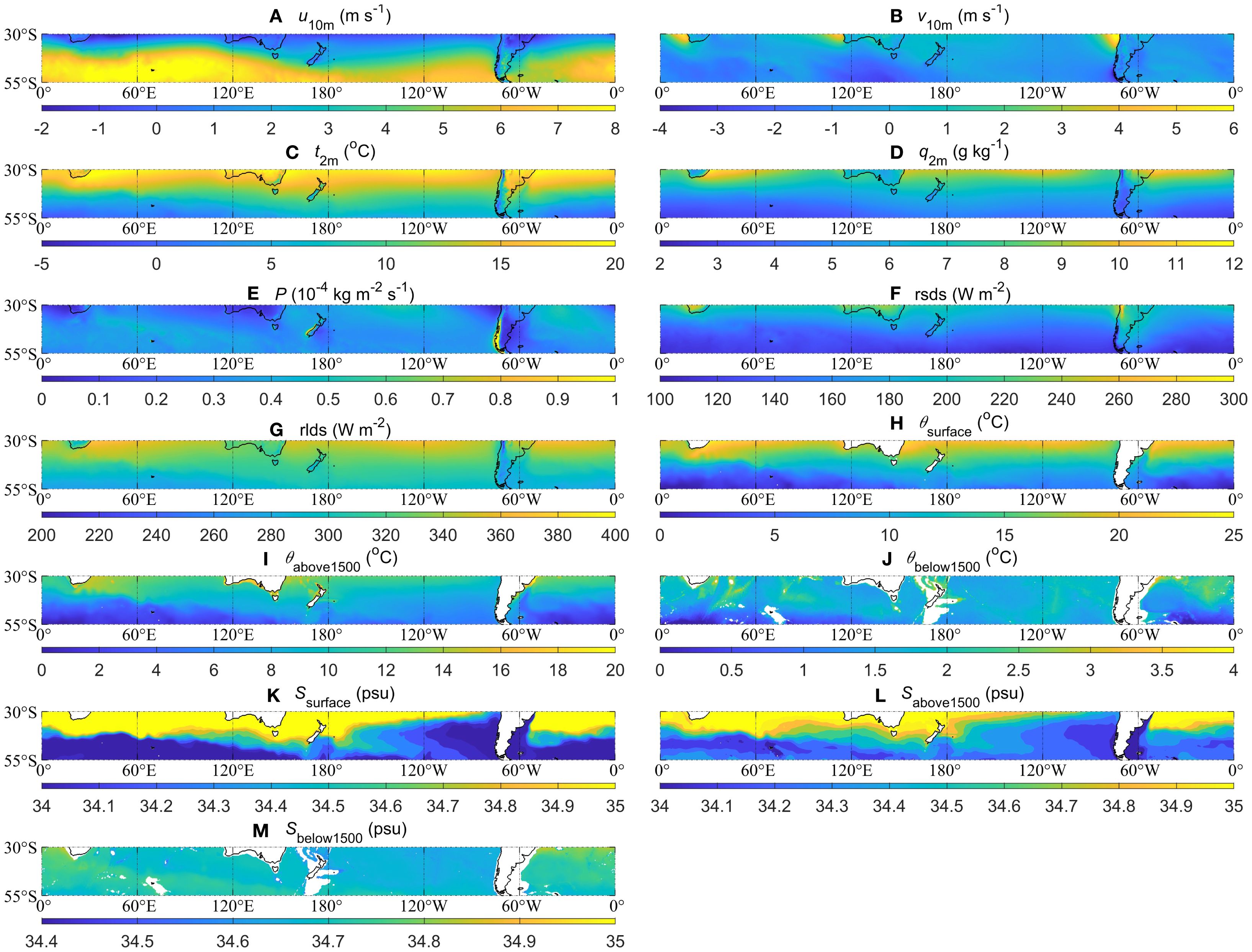Figure 1. Climatological annual mean of the reference data sets. (A-G) The climatological annual (1940-2023) mean derived from ERA5: (A) u10m (m s-1), (B) v10m (m s-1), (C) t2m (°C), (D) q2m (g kg-1), (E) P (kg m-2 s-1), (F) rsds (W m-2), and (G) rlds (W m-2). (H-M) The climatological annual (1955-2022) mean derived from WOA23: (H) θsurface (°C), (I) θabove1500 (°C), and (J) θbelow1500 (°C); (K-M) similar to (H-J) but for S (psu).