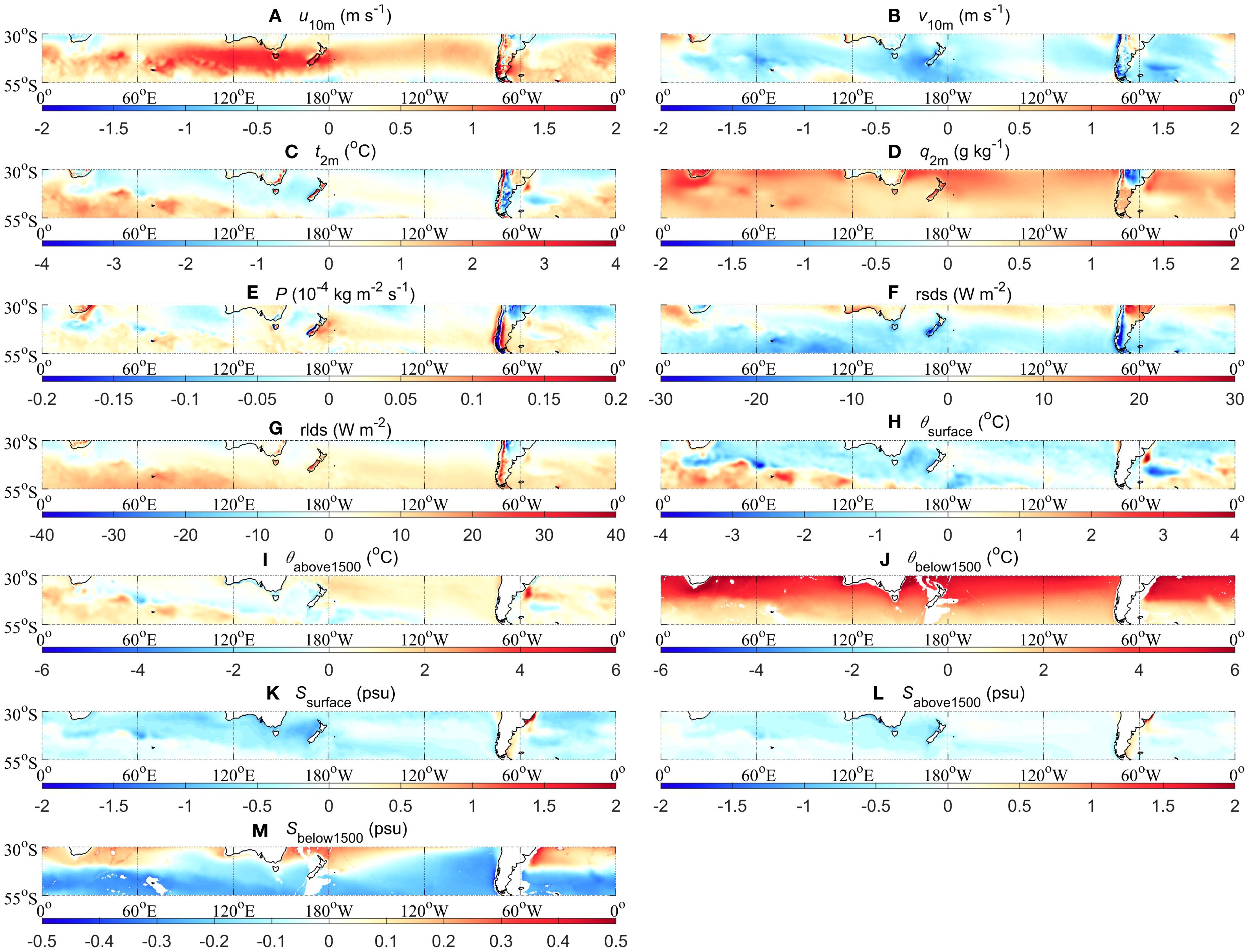 The SDESM (Equation 1) can serve as a metric to quantify the dispersion of CMIP6 ESMs outputs relative to their MME mean. The inter-model spread, quantified by the SDESM across CMIP6 simulations (Figure 3), highlights significant uncertainty in the near-surface atmospheric fields and the oceanic θ and S. The u10m shows maximum variability over the ACC region, reflecting divergent simulations of westerly jet intensity (Figure 3A). The v10m and t2m fields exhibit similar patterns with respect to the inter-model spread (Figures 3B, C), and their SDESM are generally smaller than 1 m s-1 and 1.5 °C across most regions in the STZ, respectively. In terms of q2m, CMIP6 ESMs show a greater inter-model spread at 30-40°S, especially in the coastal region (Figure 3D). Relatively larger inter-model spread of P is identified at the western Andes in South America and the western side of the New Zealand Island (Figure 3E). Compared to other variables, the rsds and rlds fields exhibit consistently higher inter-model SDESM values in CMIP6 ESMs (Figures 3F, G), underscoring systemic challenges in radiative fluxes. The inter-model spread of θsurface is less than 2 °C (Figure 3H), except for the region of the Brazil Current on the eastern side of South America. In terms of the inter-model spread of θabove1500 and θbelow1500, the CMIP6 ESMs exhibit similar spatial patterns, with a greater spread in 30-45°S, and the Southern Indian Ocean, and a relatively small spread in 45-55°S (Figures 3I, J). The distribution of the SDESM of S exhibits distinct spatial patterns in different layers: larger values of the SDESM are concentrated in subtropical regions (30-40°S) at the surface layer (Figure 3K), while there is a relatively larger inter-model spread over 45-55°S below 1500 m depths (Figure 3M). At the upper 1500 m depth, the SDESM of Sabove1500 is relatively small (Figure 3L). The maximums of the SDESM of Sabove1500 are still around the South American continent (Figures 3K-M).